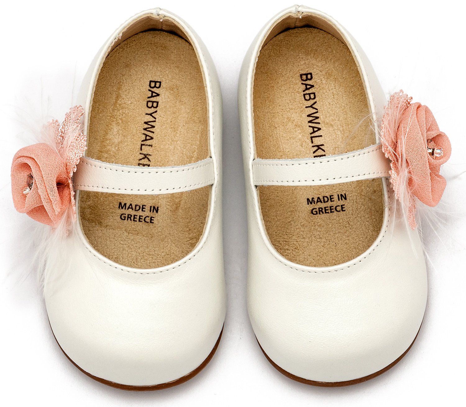 Δερμάτινο Γοβακι Μονή Μπαρέτα με Χειροποίητο Λουλουδάκι με Πούπουλα από Δέρμα Πέρλα σε Εκρού Ροζ Χρώμα