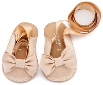 Δερμάτινο Γοβάκι Μονή Μπαρέτα με Υφασμάτινο Χειροποίητο Φιογκάκι σε Εκρού Ροζ Χρώμα