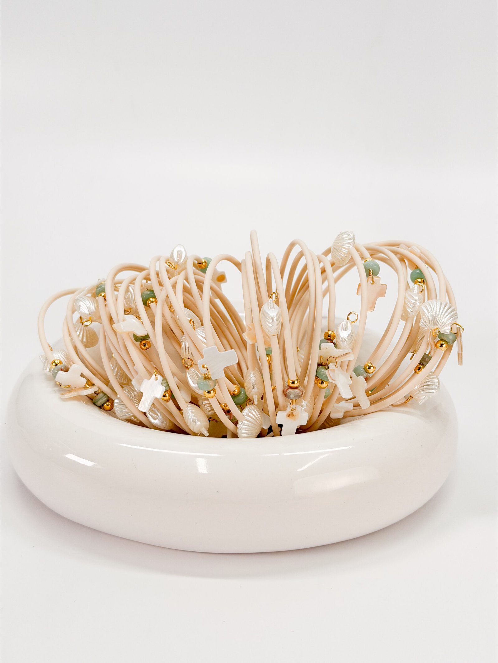 Μαρτυρικό βραχιόλι με καουτσούκ κορδόνι,memory wire,μοτιφ αχιβάδας,βεραμάν χάντρα και σταυρό φίλντισι.
