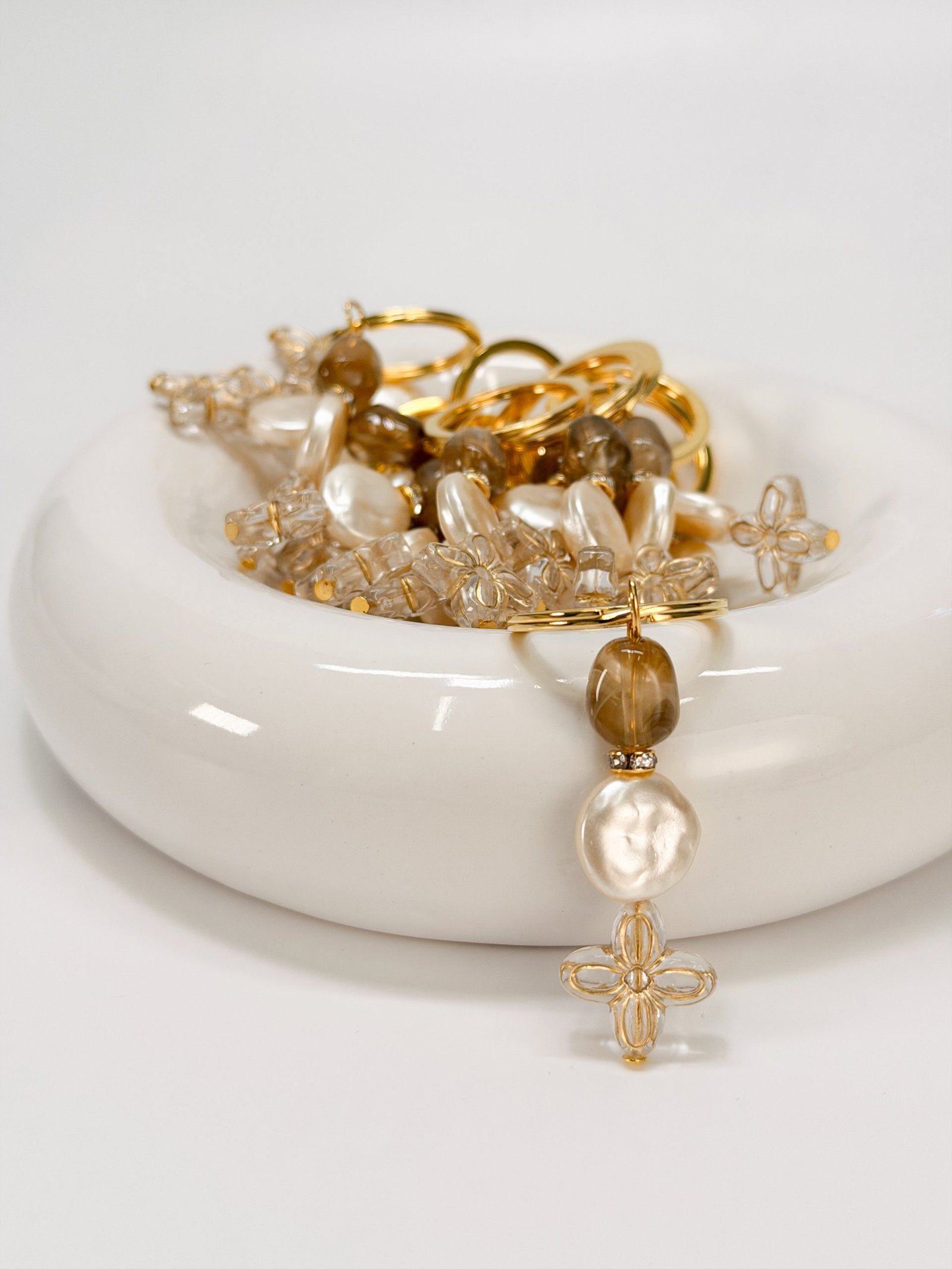 Μαρτυρικό μπρελόκ με καφέ ακρυλική χάντρα,ροδέλα με στρας,πλακε στρογγυλή πέρλα και ακρυλικό σταύρο σε σχήμα λουλουδιού.