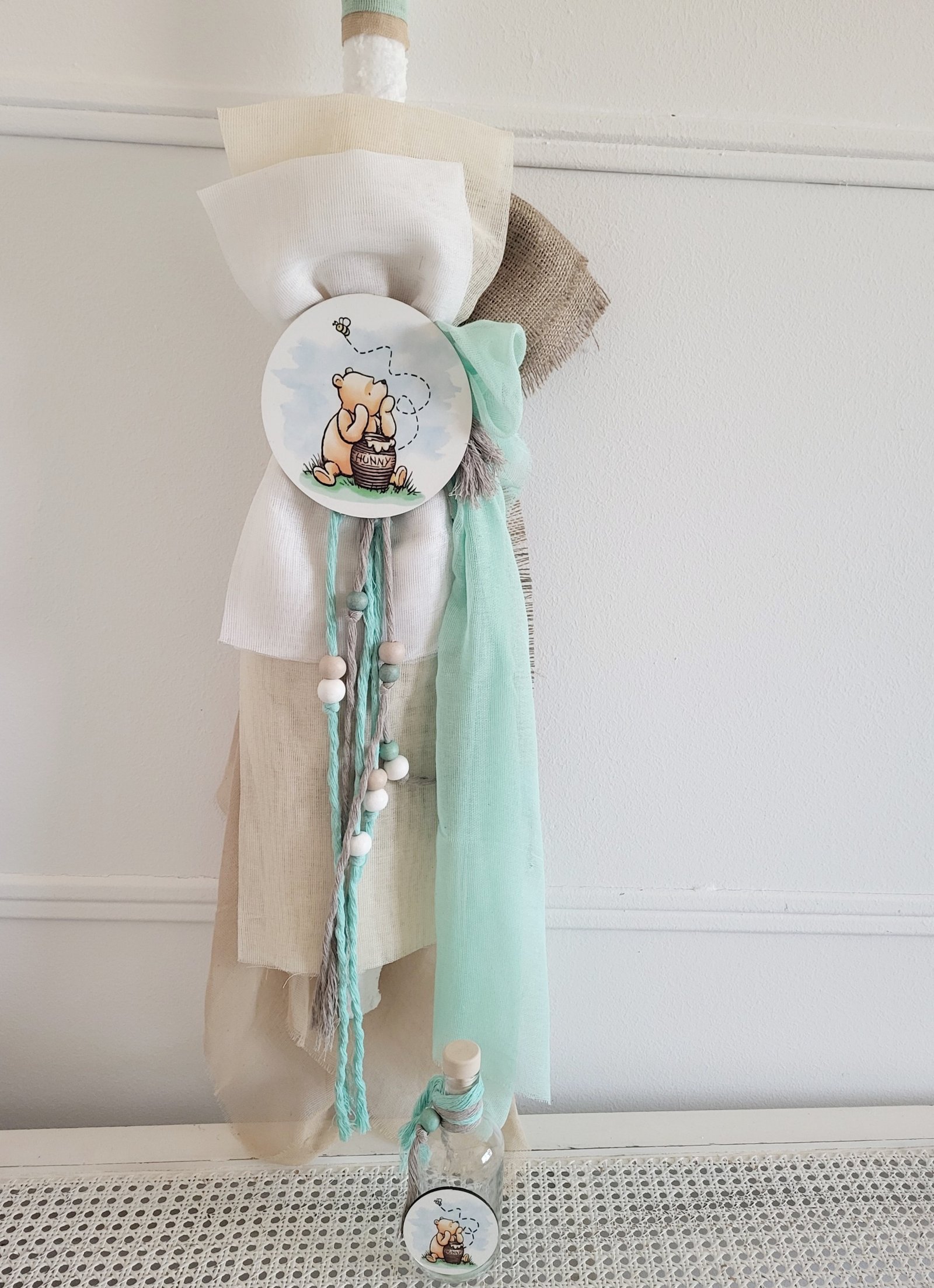 Παιχνιδιάρικη λαμπάδα για αγόρι με όμορφα δεσίματα από λινάτσα, λευκή εκρού και μέντα γάζα . Βαμβακερά σχοινιά σε μέντα και σπαγγί απόχρωση δένουν το σύνολο, ενώ μια όμορφη παράσταση με απαλά χρώματα (Γουίνι) σε ξύλινη βάση ολοκληρώνει το σύνολο.