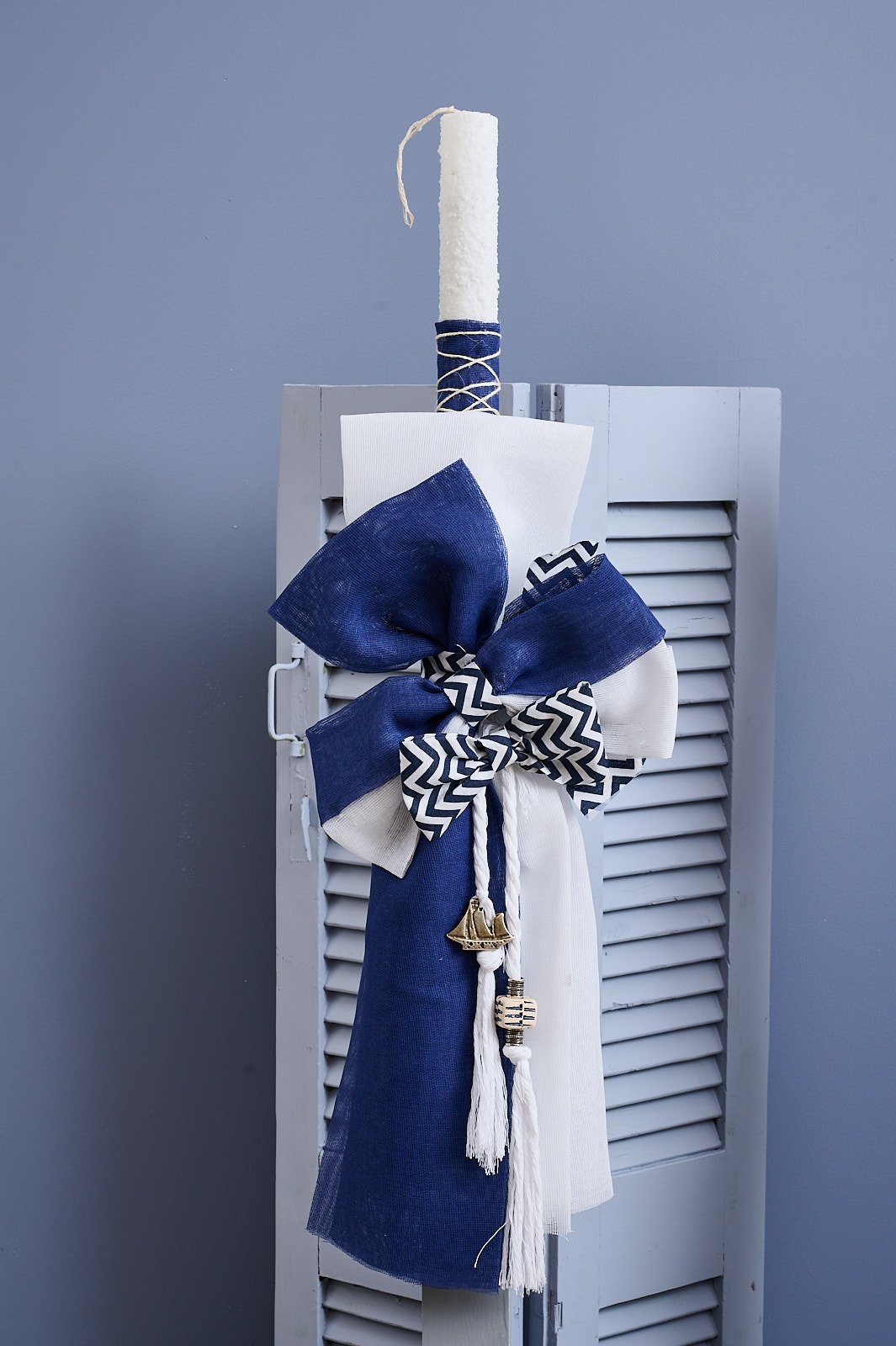 Λαμπάδα διακοσμημένη εντυπωσιακούς φιόγκους απλό μπλε και λευκή γάζα και ύφασμα μπλε-λευκό με γραμμικό μοτίβο. Σχοινί βαμβακερό, λευκό, τους δένει μεταξύ τους και μικρά, μεταλλικά στοιχεία, όπως ένα καραβάκι, όλοκληρώνει το σύνολο.