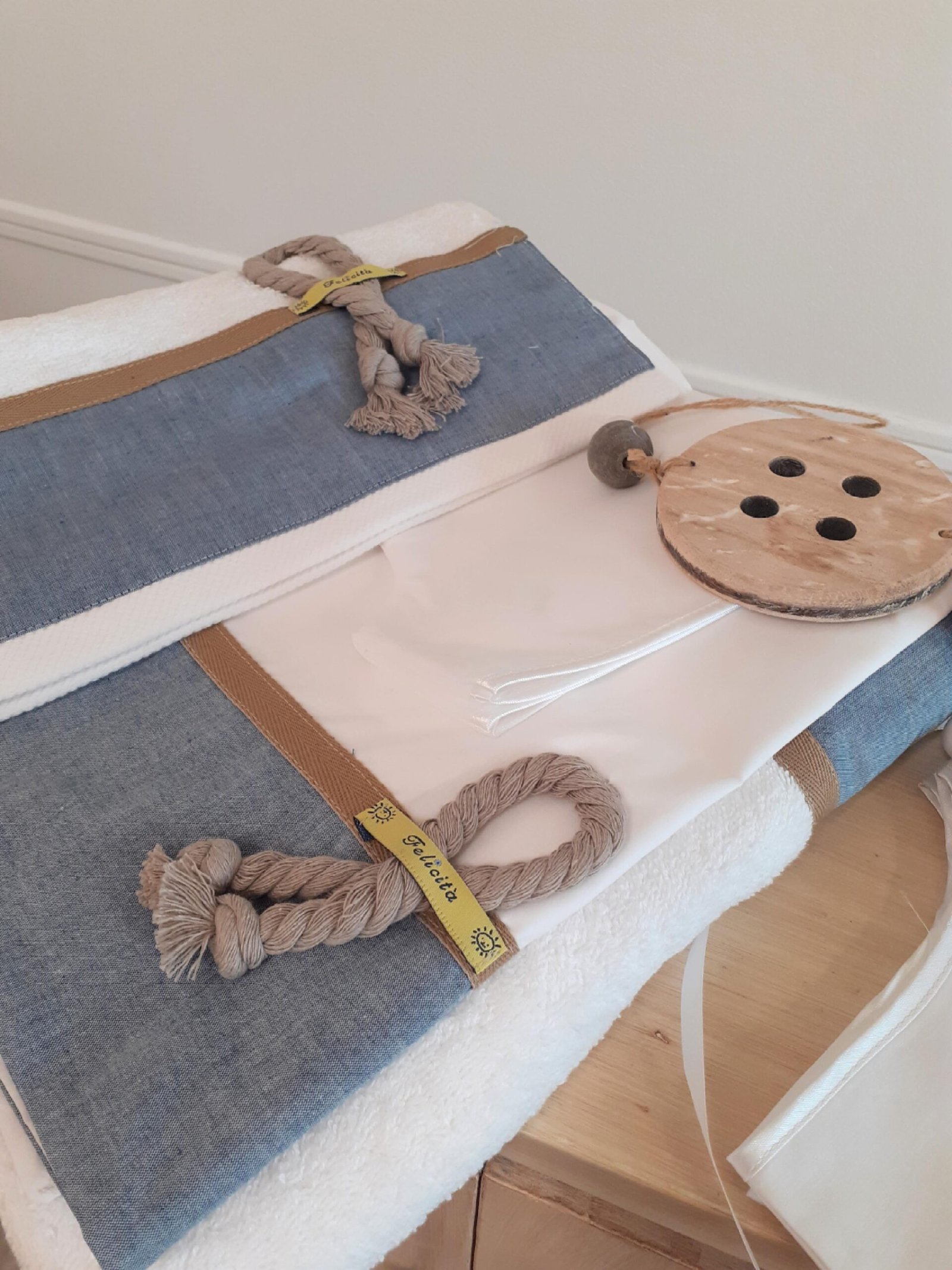 Λαδόπανα σετ λευκά για αγόρι με φαρδιά, τζιν φάσα και λεπτή καφέ τρέσα στο τελείωμα της. Διακοσμούνται με απλό, διακριτικό δέσιμο από βαμβακερό σχοινί που συγκρατείται από μια διακριτική ετικέτα “Felicita”.