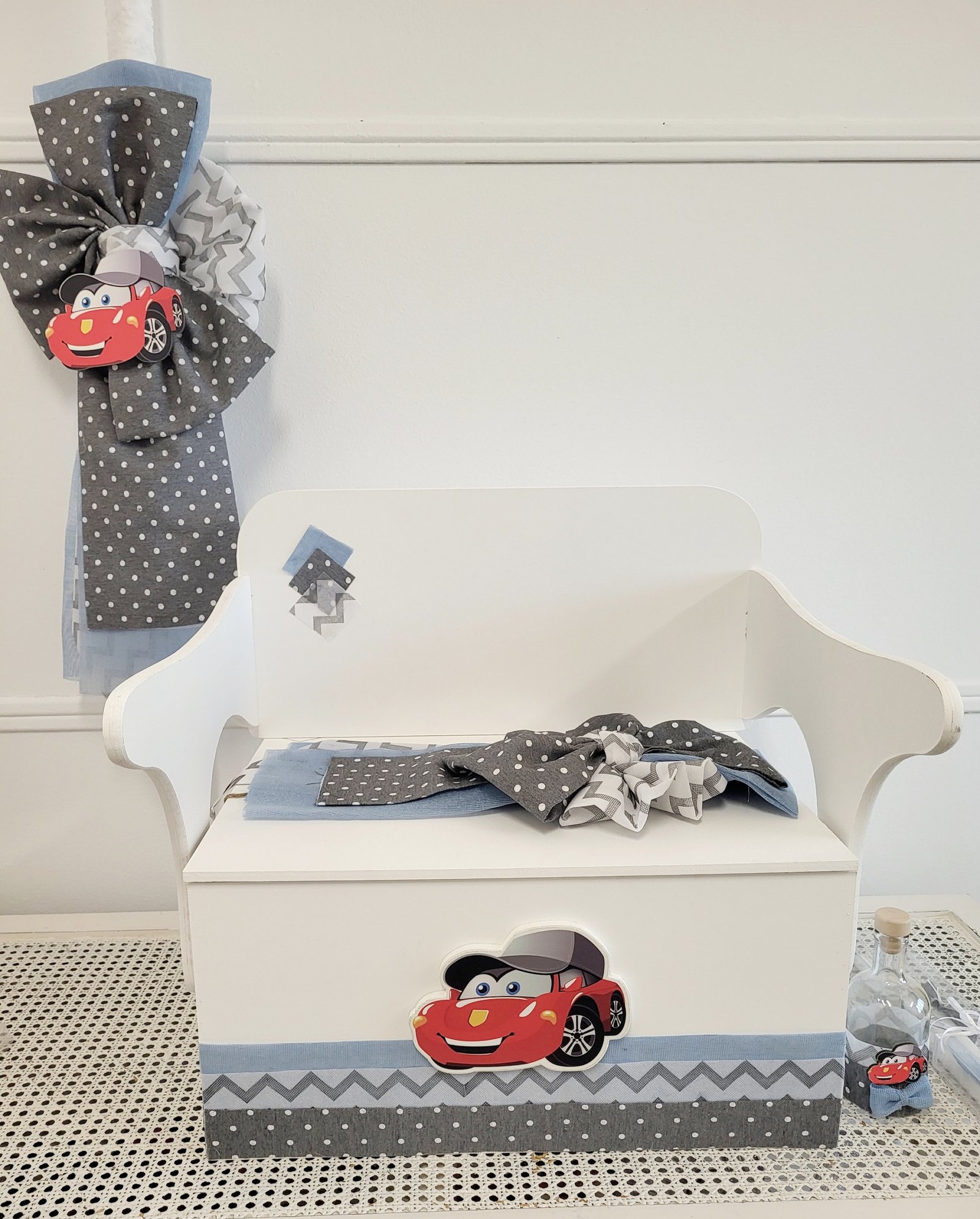 Πακέτο βάπτισης για αγόρι (λαμπάδα, παγκάκι-θρανίο από πατίνα, λαδόπανα, λαδοσέτ) με πλούσιο δέσιμο από γάζα, λευκή , σιελ ,μπλε , γκρι και καφέ γάζα . Ένα ξύλινο αυτοκινητάκι σε ψηφιακή εκτύπωση , ολοκληρώνει το σύνολο.