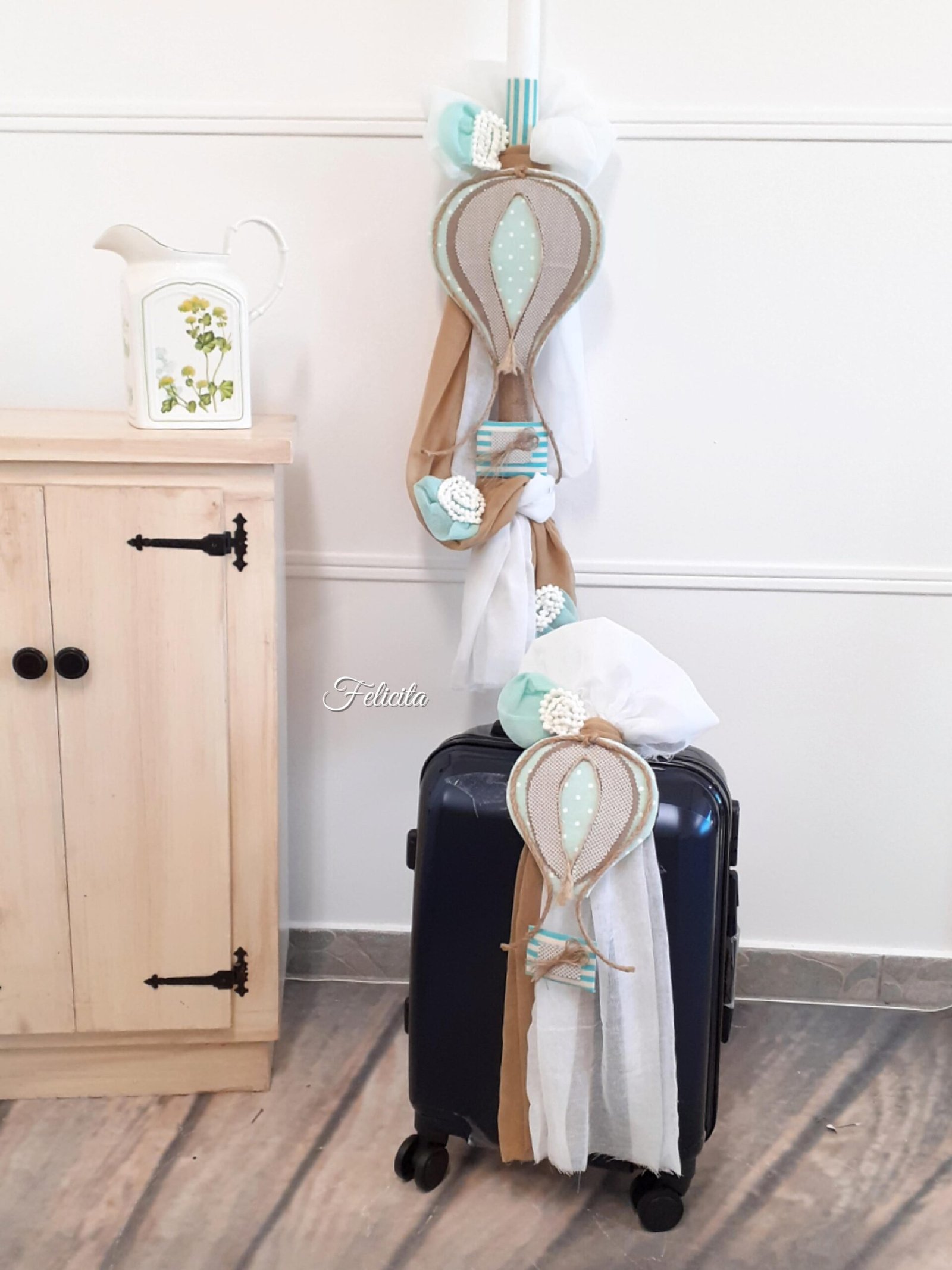 Πακέτο βάπτισης (λαμπάδα, βαλίτσα-τρόλεϊ, λαδοσέτ, λαδόπανα). Γάζες λευκές, βεραμάν και ταμπά τυλίγονται επιμελώς και δημιουργούν ένα τέλειο φόντο για το εντυπωσιακό, υφασμάτινο αερόστατο σε αποχρώσεις μπεζ, λευκού και βεραμάν. Λεπτομέρειες από βεραμάν ύφασμα και κυπούρ κορδέλες σαν στρόβιλοι ολοκληρώνουν το σύνολο.