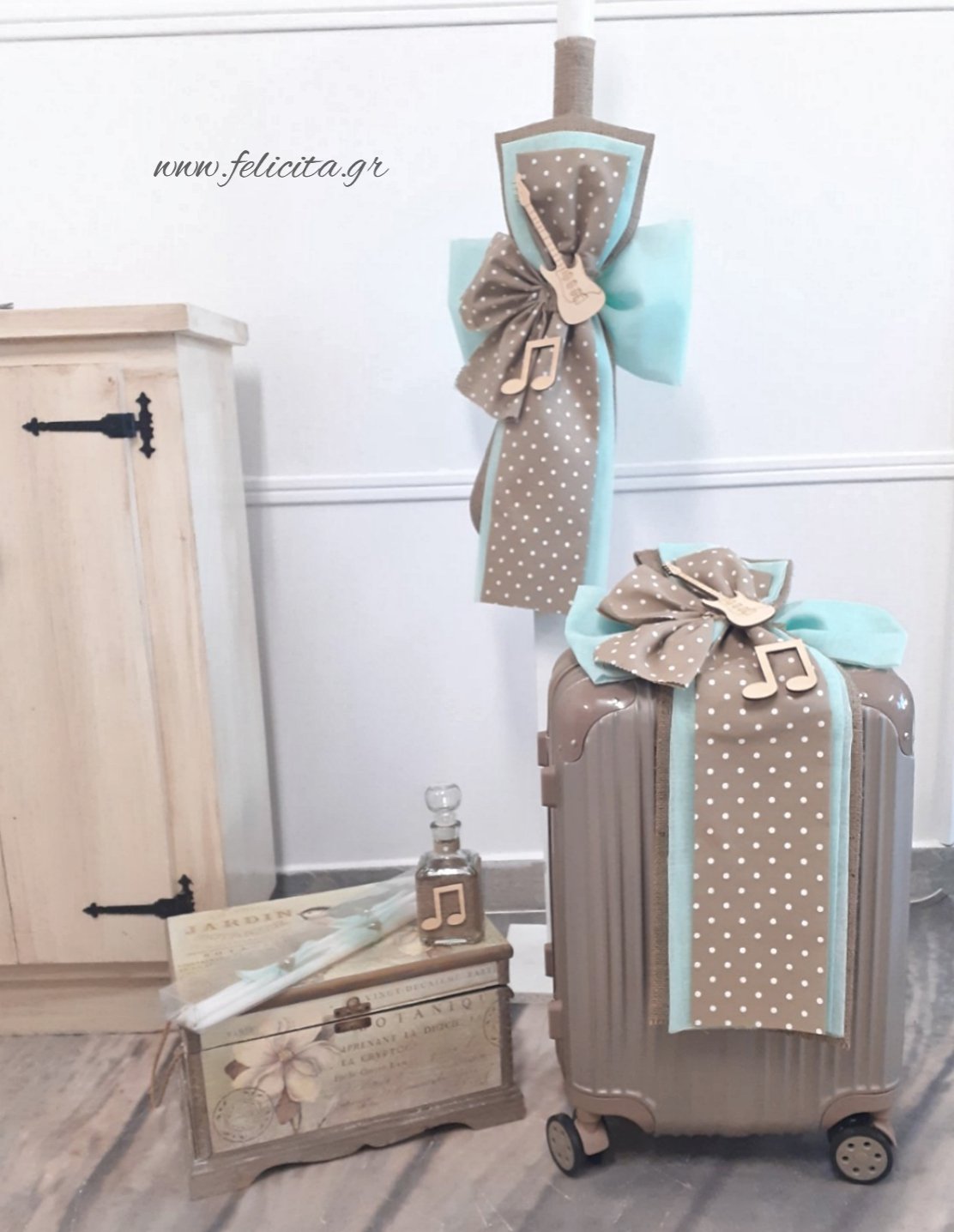 Πακέτο βάπτισης (λαμπάδα, βαλίτσα-τρόλεϊ, λαδοσετ, λαδόπανα) με θέμα τη μουσική. Κορδέλες φαρδιές από βεραμάν και μπεζ τούλι, ύφασμα με βεραμάν-λευκό, κυματιστό μοτίβο, δένουν με φιόγκο από φυσική λινάτσα και με ένα πιο μικρό, υφασμάτινο πουά παπιγιόν σε απόχρωση της μόκας. Το σύνολο ολοκληρώνει μια ξύλινη νότα και μια ξύλινη κιθάρα. Ο ίδιος στολισμός επαναλαμβάνεται και στη βαλίτσα-τρόλεϊ.