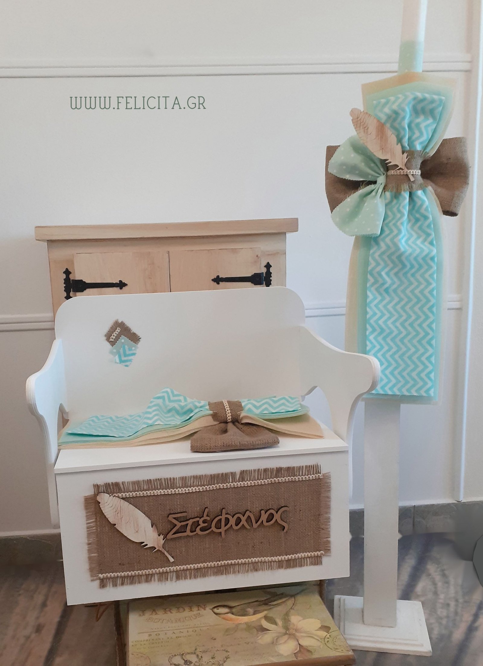 Πακέτο βάπτισης (λαμπάδα, παγκάκι-θρανίο, λαδοσετ, λαδόπανα) με θέμα το φτερό. Κορδέλες φαρδιές από βεραμάν και μπεζ τούλι, ύφασμα με βεραμάν-λευκό, κυματιστό μοτίβο, δένουν με φιόγκο από φυσική λινάτσα και με ένα πιο μικρό βεραμάν, πουά παπιγιόν και το σύνολο ολοκληρώνει ένα ξύλινο φτερό. Ο ίδιος στολισμός επαναλαμβάνεται και στο θρανίο-παγκάκι ενώ στην μπροστινή του όψη μια τρέσσα από φυσική λινάτσα και κρόσια στο τελείωμα φτιάχνει το τέλειο κάδρο για το ξύλινο όνομα της επιλογής σας και το ξύλινο φτερό του θέματος.