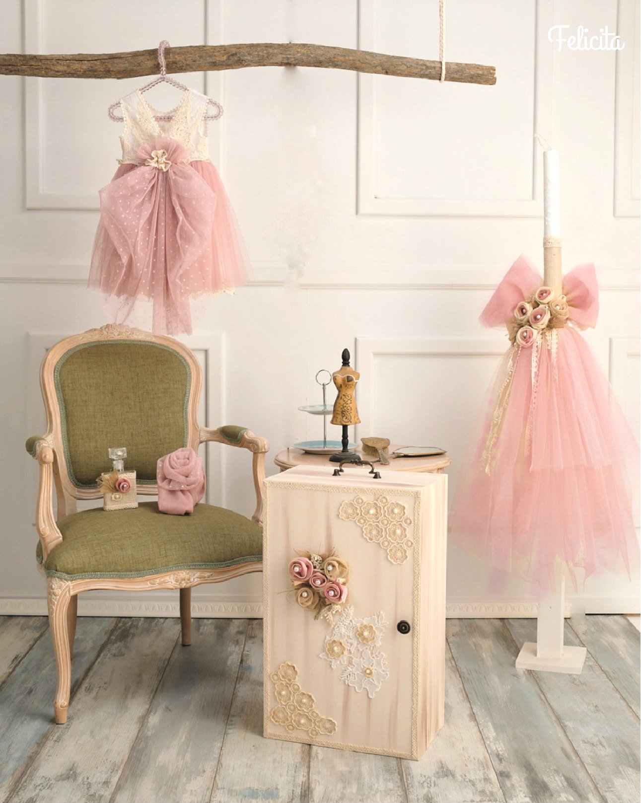 Πακέτο με λαμπάδα σε αποχρώσεις σάπιου μήλου και εκρού με κεντρικο θέμα το μπουκέτο απο χειροποιητα λουλούδια