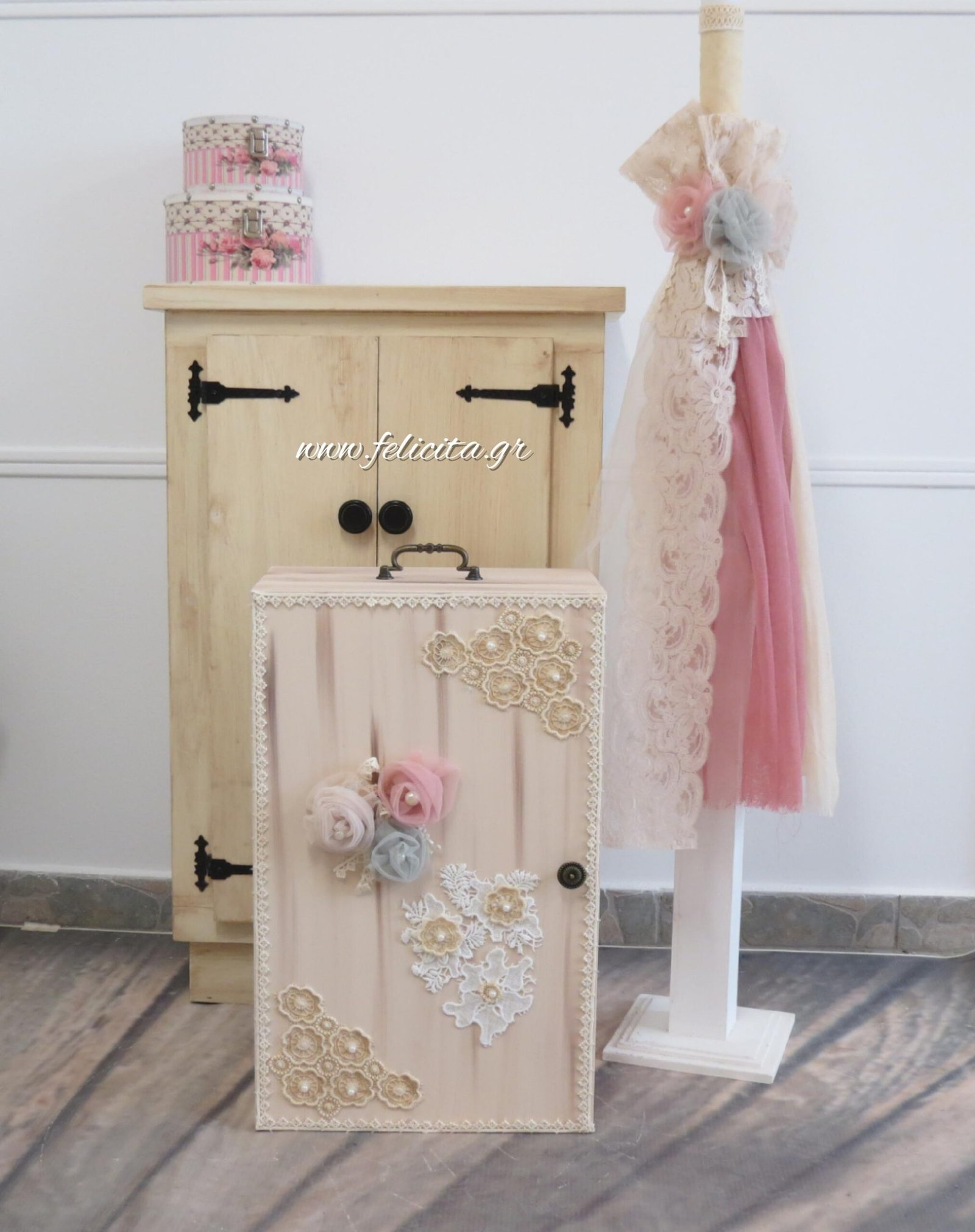 Ένα εντυπωσιακό πακέτο (λαμπάδα, κουτί-ντουλάπα, λαδοσέτ, λαδόπανα) σε αποχρώσεις εκρού και σάπιου μήλου. Στρώσεις από τούλι και φαρδιά δαντέλα δένουν κομψά μεταξύ τους και διακοσμούνται από μεγάλα, τούλινα τριαντάφυλλα σε αποχρώσεις εκρού, γκρι και σάπιου μήλου με λεπτομέρειες από πέρλες.
