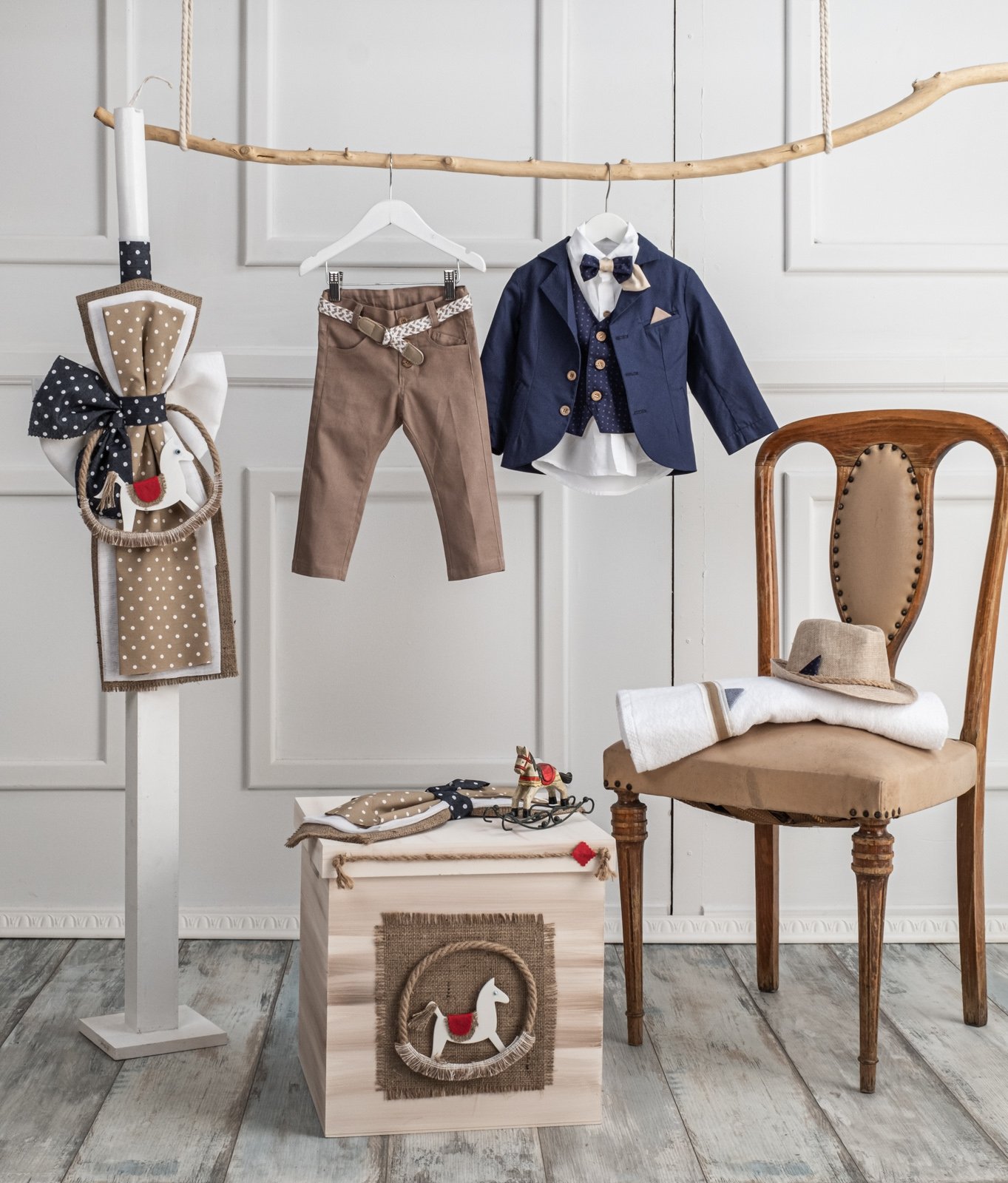 Κλασικό πακέτο βάπτισης (λαμπάδα, κύβος-κουτί πατίνας, λαδοσετ, λαδόπανα) με θέμα το κουνιστό αλογάκι. Ένα όμορφο δέσιμο από υφάσματα σε καφέ, λευκό και μπεζ πουά μαζί με ένα μεγάλο φιόγκο σε λευκό και μπλε πουά που δένει στο πίσω μέρος της λαμπάδας διακοσμείται από ένα στεφανάκι από φυσικό σχοινί, που στο κέντρο του κάθεται ένα ξύλινο, λευκό αλογάκι. Παρόμοιο μοτίβο ακολουθεί και το κουτί πατίνας. Συνδυάζεται άψογα με το ντύσιμο με μπλε σακάκι.