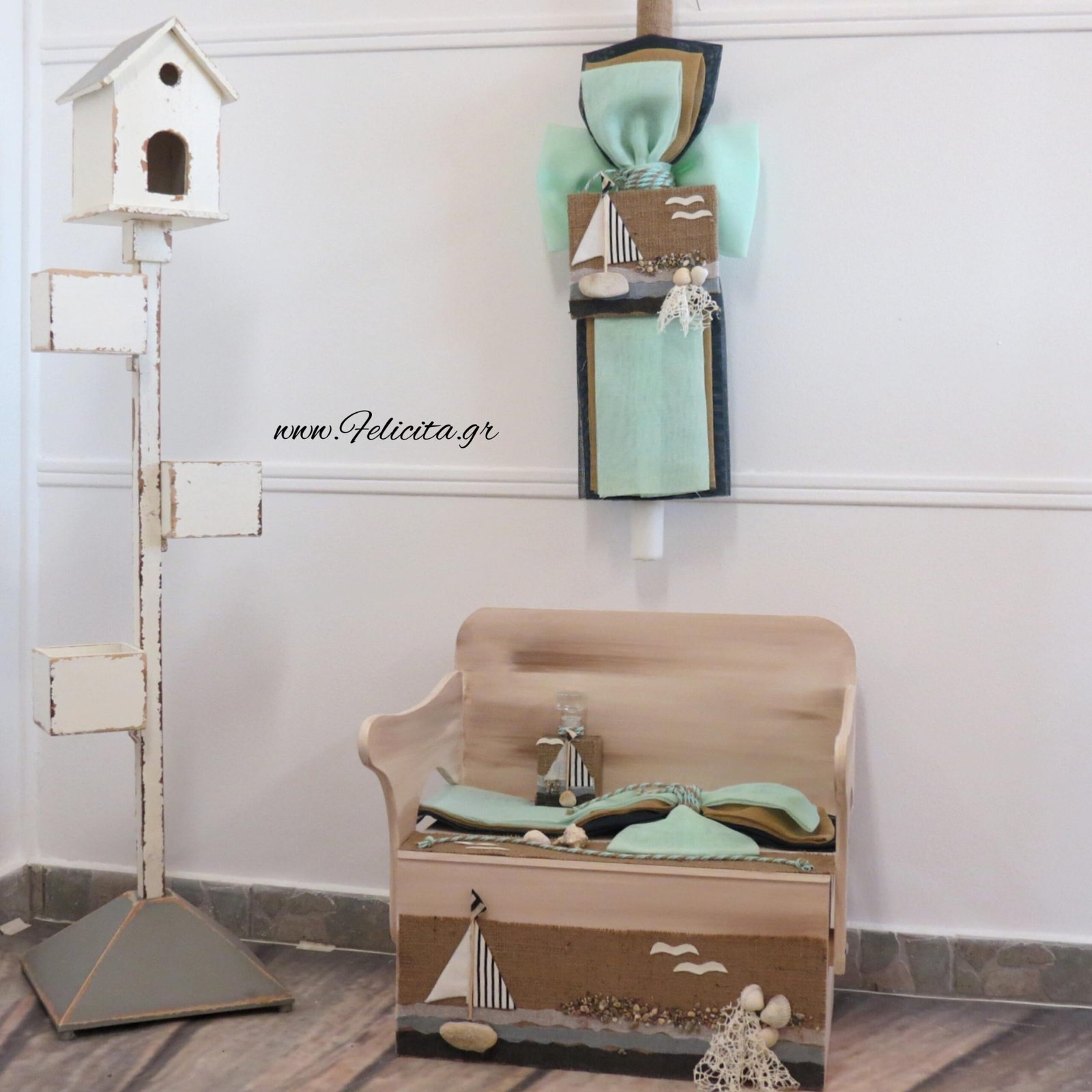 Πακέτο βάπτισης (παγκάκι-θρανίο πατίνας ,λαμπάδα, λασοτετ) με θέμα το καράβι. Γάζες σε βεραμάν, μπλε και της άμμου αποχρώσεις δένουν με βεραμάν-γκρι σχοινί. Τόσο η λαμπάδα όσο και το παγκάκι διακοσμούνται από μια θαλασσινή παράσταση που έχει δημιουργηθεί πάνω σε λινάτσα από ύφασμα, δίχτυ αλλά και φυσικά στοιχεία, όπως κοχύλια και βότσαλα.