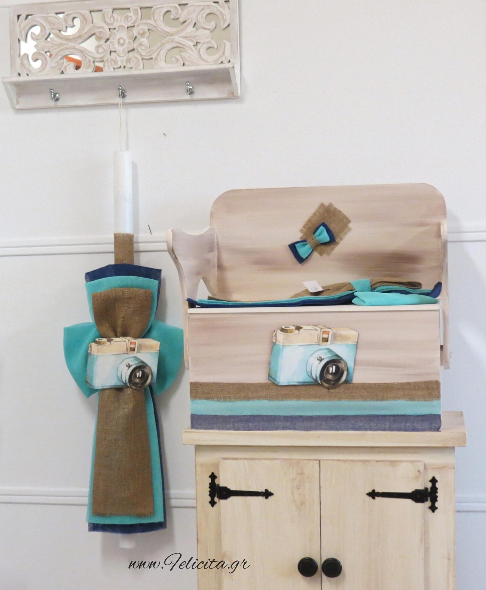 Εντυπωσιακό πακέτο βάπτισης (λαμπάδα, παγκάκι-θρανίο πλατίνας, λαδοσετ) με θέμα τη φωτογραφική μηχανή. Γάζες μπλε, τιρκουάζ και στην απόχρωση της άμμου δένουν γραμμικά κατά μήκος της λαμπάδας αλλά και του θρανίου ενώ το σύνολο ολοκληρώνει μια ξύλινη, ζωγραφισμένη φωτογραφική μηχανή.