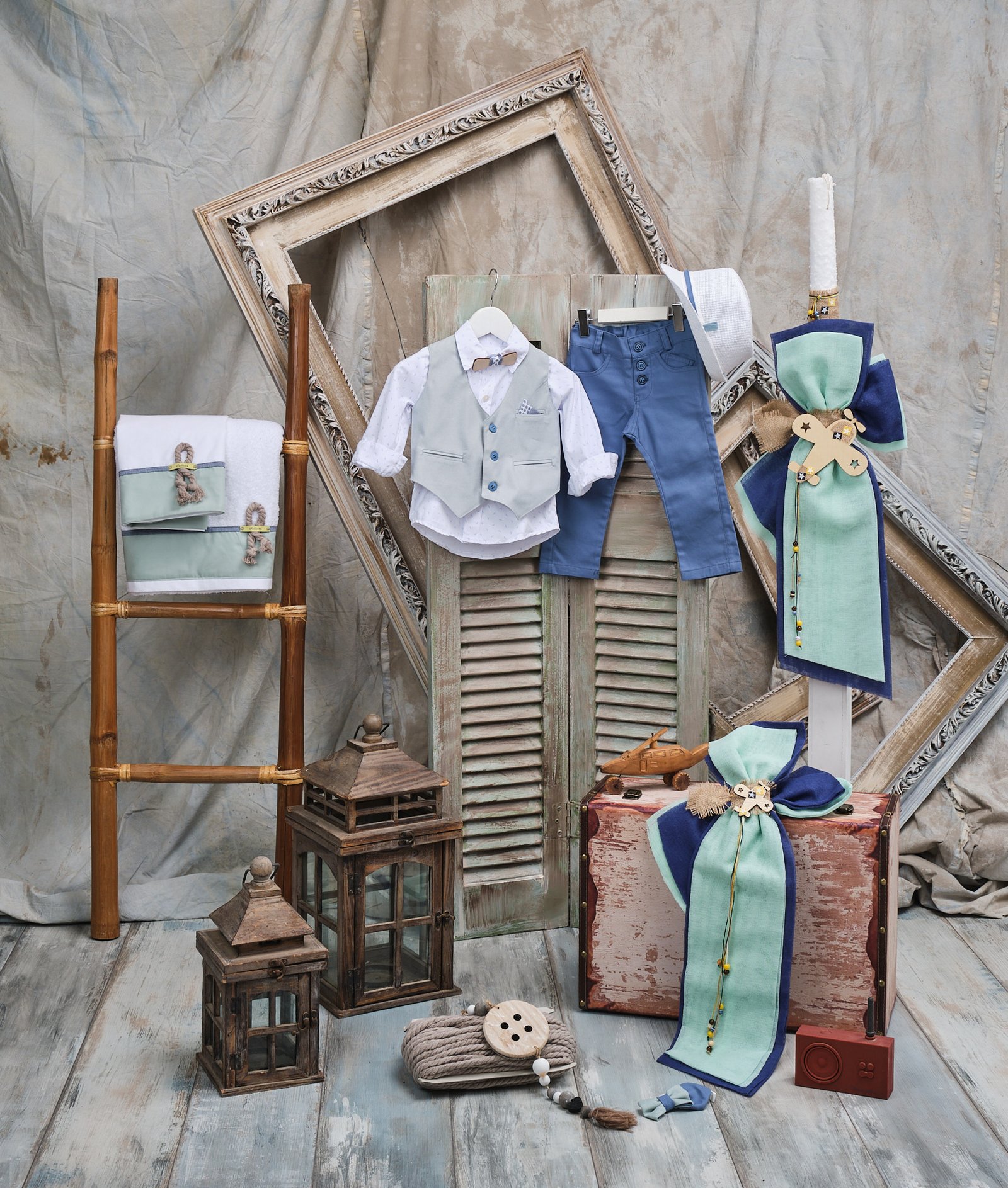 Πακέτο βάπτισης (λαμπάδα, ξύλινη βαλίτσα vintage, λαδοσετ, λαδόπανο) σε αποχρώσεις λευκό, μπλε και βεραμάν. Τόσο στη λαμπάδα όσο και στη βαλίτσα επικρατεί το ξύλινο αεροπλανάκι πλαισιωμένο από συνδυασμό μπλε, βεραμάν και καφέ υφασμάτων. Το σετ λαδόπανα με βεραμάν φάσα διακοσμούνται από ένα κόμπο από φυσικό σχοινί.