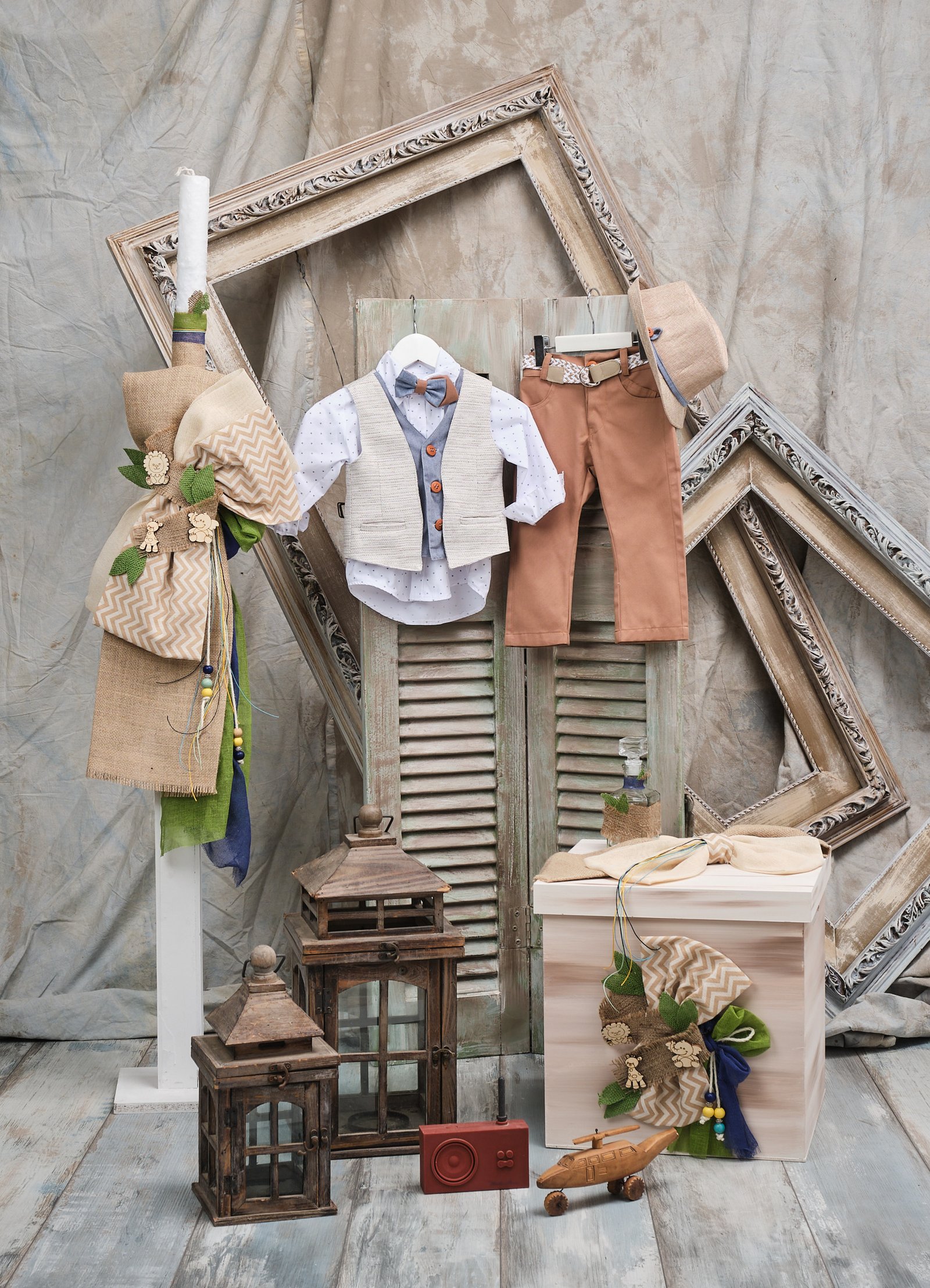 Πακέτο βάπτισης (λαμπάδα, κουτί πατίνας, λαδοσετ, λαδόπανο) σε αποχρώσεις μπεζ, πράσινο και μπλε με ξύλινα στοιχεία από ζωάκια της ζούγκλας. Τόσο στη λαμπάδα όσο και στο κουτί από πατίνα οι γάζες σε χρώμα πράσινο και μπλε, η λινάτσα αλλά και το ύφασμα με κυματιστό μπεζ σχέδιο μπλέκονται με τέτοιο τρόπο μεταξύ τους ώστε να φανερώνουν το παιχνιδιάρικο ύφος μιας ζούγκλας.