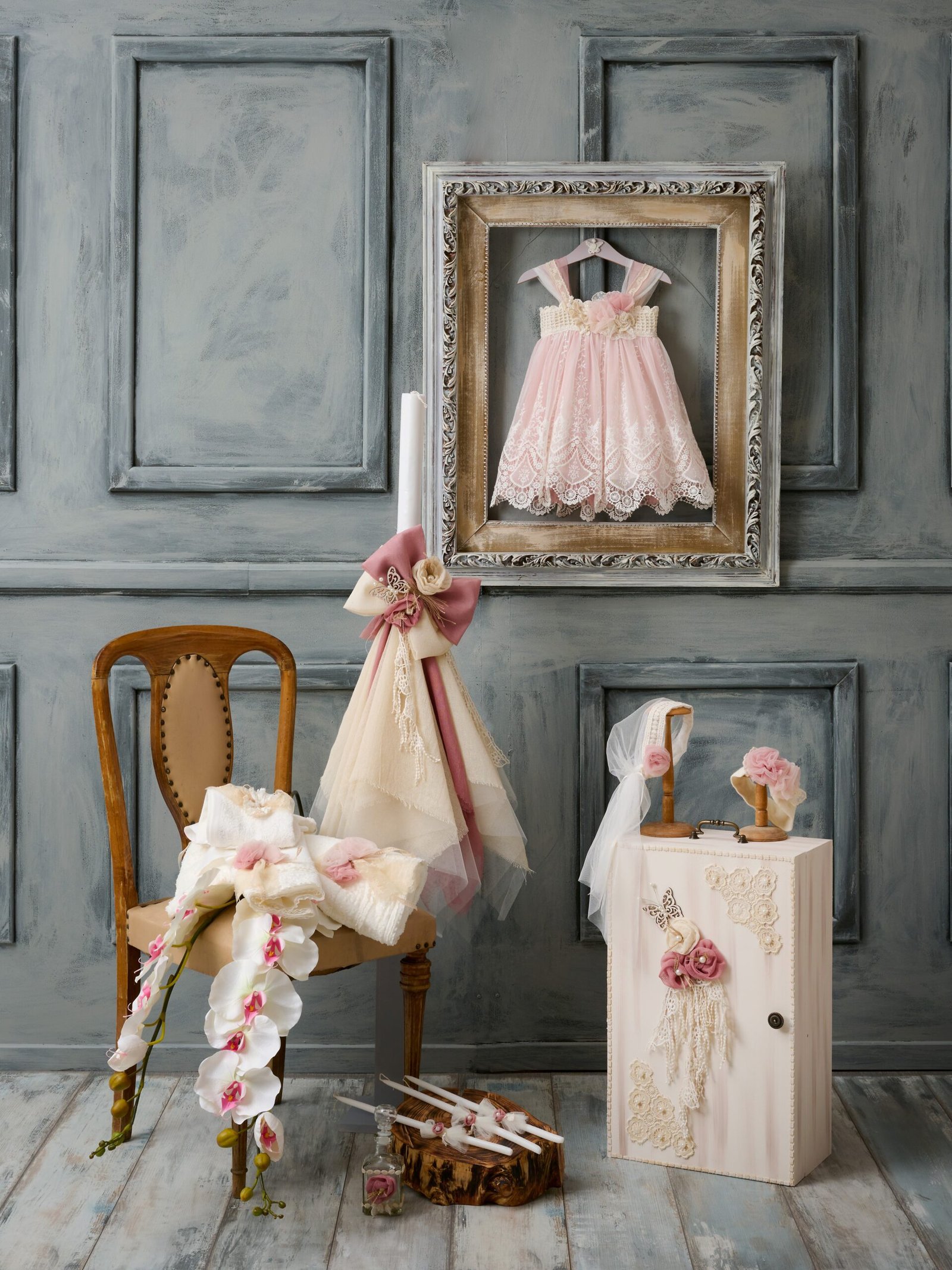 Πακέτο βάπτισης ¨άνοιξη¨ (λαμπάδα, ντουλάπα, λαδοσέτ, λαδόπανα) σε αποχρώσεις του εκρού και του σάπιου μήλου. Κυρίαρχο στοιχείο αποτελούν τα υφασμάτινα λουλούδια που πλαισιώνονται από boho δαντέλα, πέρλες και μια περίτεχνη ξύλινη πεταλούδα. Η λαμπάδα είναι στολισμένη από πλούσιες στρώσεις από τούλι σε εκρού και σάπιο μήλο, ξεκινώντας από δυο μεγάλους φιόγκους, πάνω στους οποίους κάθονται τα λουλούδια και η πεταλούδα και καταλήγοντας σε μια κομψή “φούστα” από τούλι. H ντουλάπα, κρατώντας το βασικό χαρακτηριστικό της σύνθεσης των λουλουδιών και της πεταλούδας, έχει επίσης λεπτομέρειες από πλεκτά λουλούδια, διακοσμημένα με πέρλες.