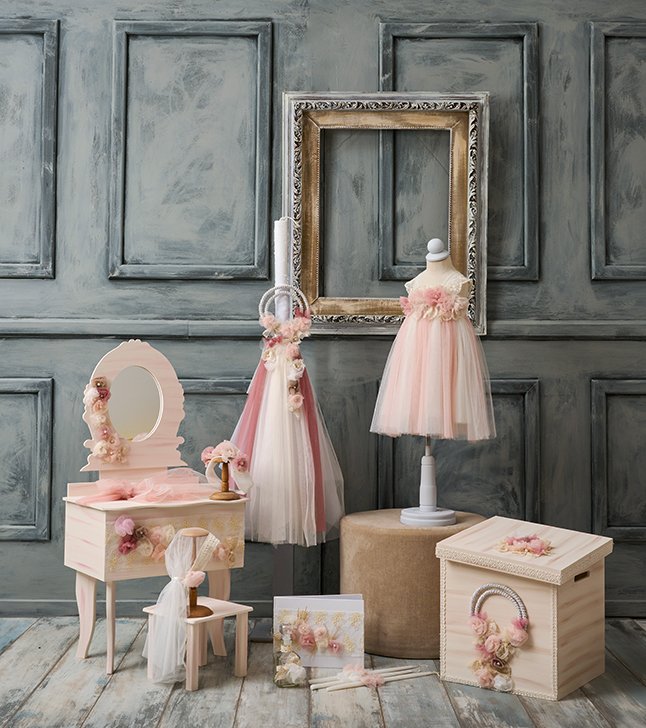 Πακέτο βάπτισης για κορίτσι (καπελιέρα, λαμπάδα, λαδοσέτ, λαδόπανο) με κυρίαρχο διακοσμητικό στοιχείο μια χειροποίητη λευκή ονειροπαγίδα. Η ονειροπαγίδα, η οποία διακοσμεί και τη λαμπάδα και την καπελιέρα, είναι στολισμένη με μικρά υφασμάτινα τριαντάφυλλα σε αποχρώσεις του ροζ και του σάπιου μήλου. Μια όμορφη πλεξούδα από λευκή και σε απόχρωση του σάπιου μήλου γάζα διακοσμεί την καπελιέρα. Η λαμπάδα στολίζεται από έναν όμορφα πλεγμένο κόμπο από γάζες στις ίδιες αποχρώσεις, από τον οποίο ξεπετάγονται μικρά τριανταφυλλάκια, ενώ στο τελείωμα του κρέμεται η ονειροπαγίδα με ένα μεγάλο κομμάτι γάζας σε σάπιο μήλο να “τρέχει” από τη μέση της.