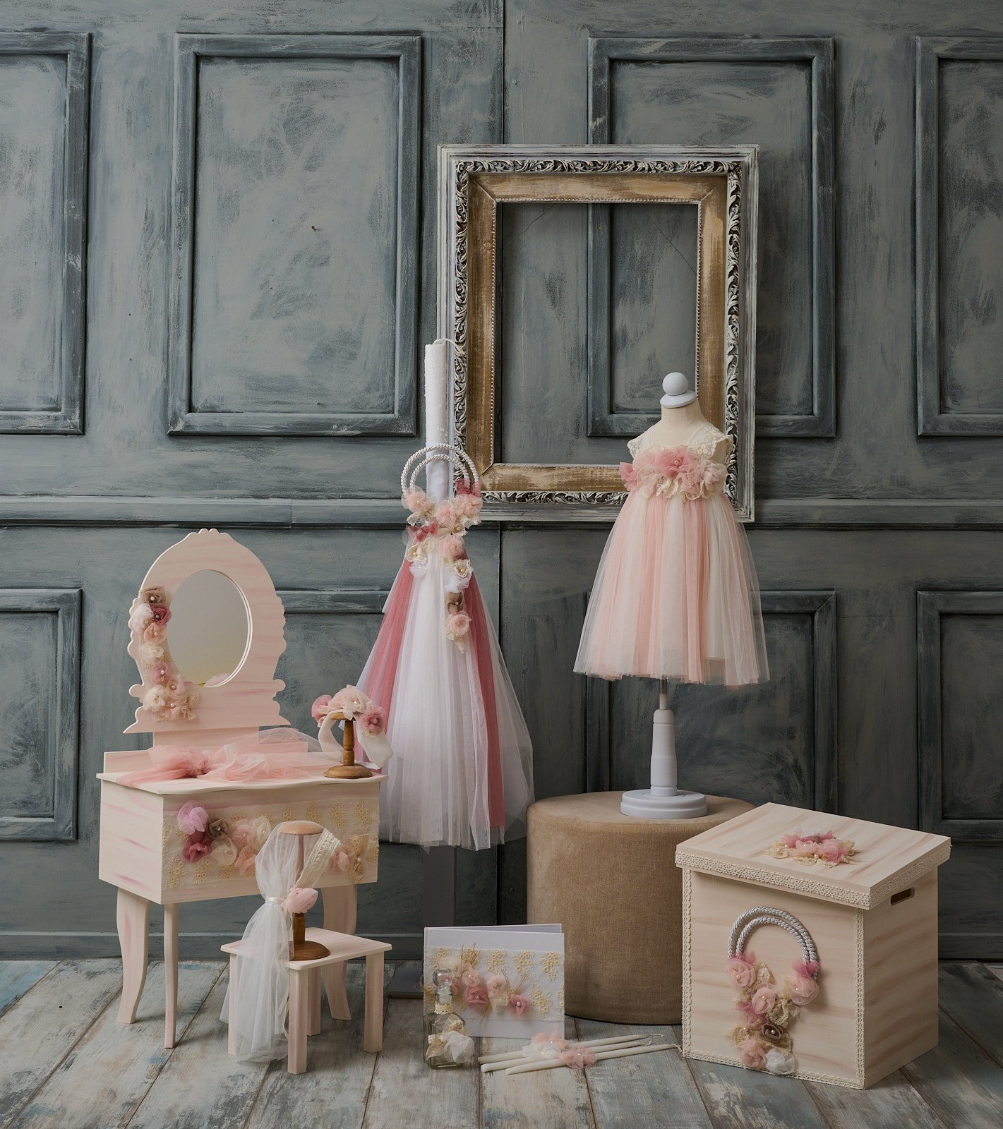 Ρομαντικό πακέτο βάπτισης (λαμπάδα, μπουντουάρ ή κουτί κύβος από πατίνα, λαδοσέτ, λαδόπανα) με λουλούδια σε αποχρώσεις του εκρου, σομον και σάπιου μήλου. Η λαμπάδα στολίζεται από διπλό στεφανάκι. Τα δυο στεφάνια διακοσμούνται στο κάτω μέρος από μια πανδαισία τούλινων λουλουδιών σε αποχρώσεις του καφέ, σομόν και σάπιου μήλου, τα οποία απλώνονται και προς το κάτω μέρος . Δεξιά και αριστερά, κατά μήκος, δυο μακριές τούλινες φάσες στο χρώμα του σάπιου μήλου ολοκληρώνουν τη σύνθεση. Αντίστοιχα, το ξύλινο μπουντουάρ, διακοσμείται στο κάτω μέρος από μια φαρδιά δαντελένια φάσα και με τούλινα λουλούδια σε ιβουάρ, καφέ, σομόν και σάπιου μήλου αποχρώσεις. Το ίδιο μοτίβο αγκαλιάζει και τη μια πλευρά περιμετρικά του καθρέφτη.