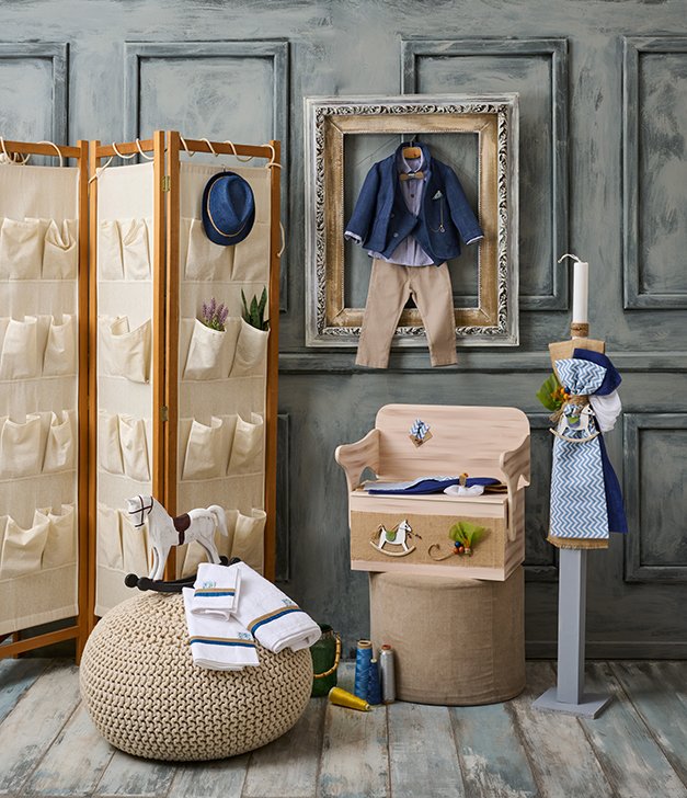 Πακέτο βάπτισης (λαμπάδα/κουτί-παγκάκι πατίνας/λαδοσετ/λαδόπανο) σε αποχρώσεις καφέ και μπλε. Κυρίαρχο στοιχείο αποτελεί το ξύλινο λευκό αλογάκι, ενώ το δέσιμο της λαμπάδας αποτελείται από καφέ γάζα , μπλε λινάτσα και ένα ιδιαίτερο γαλάζιο/λευκό ύφασμα με κυματιστό σχέδιο. Όλη τη σύνθεση την ολοκληρώνουν οι μικρές χρωματιστές λεπτομέρειες από χάντρες και σχοινί «τριχιά».