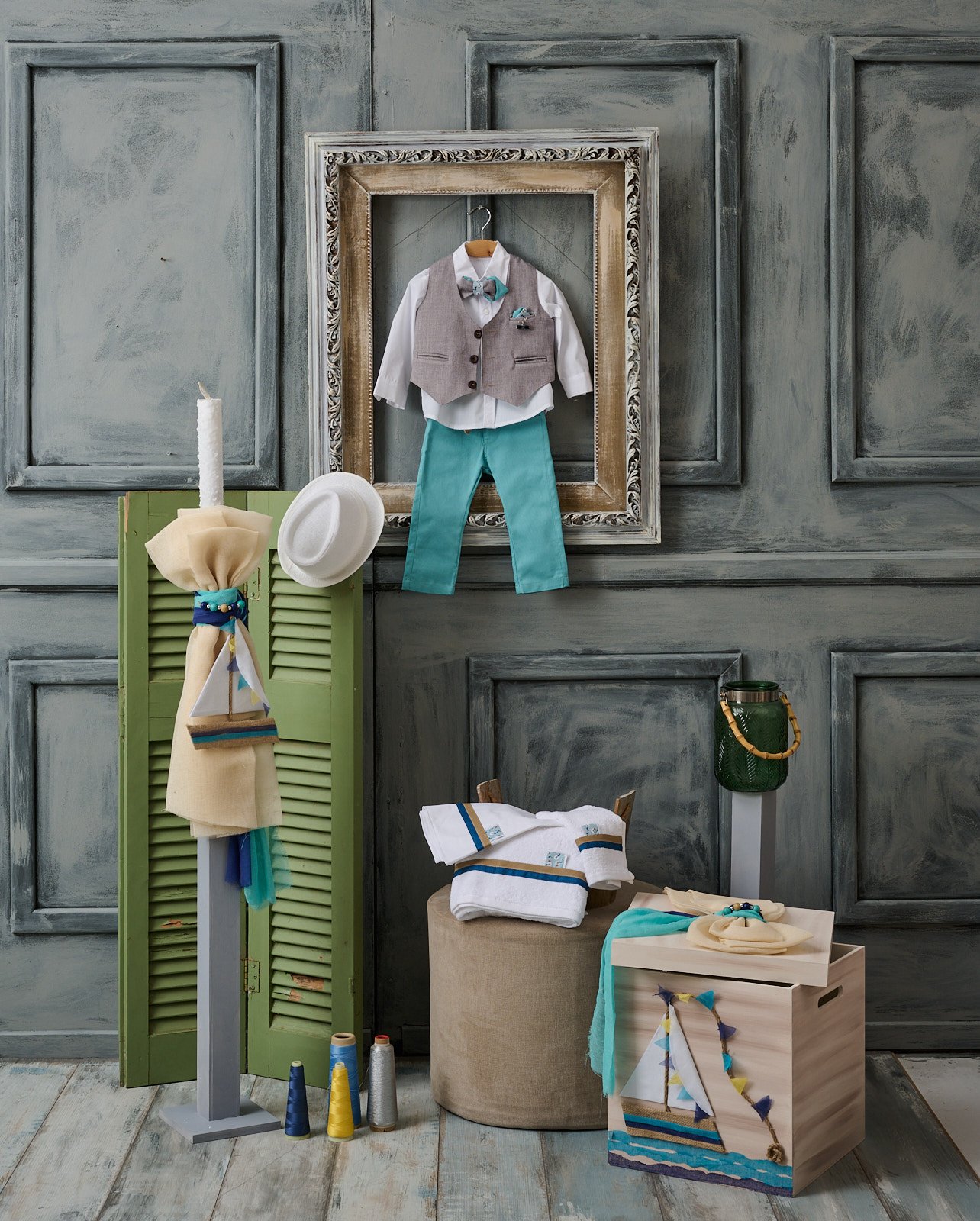 Πακέτο βάπτισης (λαμπάδα, κουτί πατίνας, λαδοσετ, λαδόπανο) σε αποχρώσεις μπέζ παστέλ, βεραμάν και ξύλου. Τόσο το κουτί όσο και η λαμπάδα έχουν ως κυρίαρχο στοιχείο το υφασμάτινο καραβάκι, που τον πλαισιώνει ένα δέσιμο από εκρού, τυρκουάζ και μπλε γάζα. Όλη τη σύνθεση την ολοκληρώνουν ξύλινες στα χρώματα του συνόλου χάντρες και τα υφασμάτινα σημαιάκια του καραβιού.