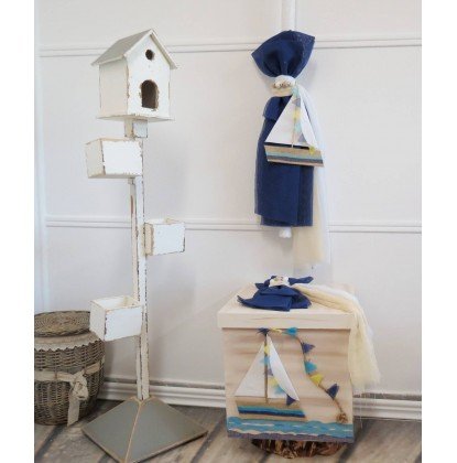 Πακέτο βάπτισης (λαμπάδα, κουτί πατίνας, λαδοσετ, λαδόπανο) σε αποχρώσεις μπεζ παστέλ, λευκό και μπλέ. Μια κομψή σύνθεση από μπλε σκούρο ύφασμα δένει με βαμβακερό λευκό σχοινί, ενώ κρέμεται ένα χειροποίητο υφασμάτινο καραβάκι. Το ίδιο μοτίβο επαναλαμβάνεται και στη διακόσμηση του κουτιού πατίνας.