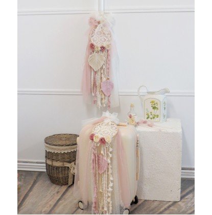 Boho πακέτο βάπτισης (λαμπάδα, βαλίτσα-τρόλεϊ, λαδοσέτ) με ένα ατημέλητο σχέδιο από τούλι σε εκρού και ροζ απόχρωση, κυπούρ κορδέλες, φουντάκια και τούλινα λουλούδια σε απόχρωση σάπιου μήλου. Μια boho ονειροπαγίδα ολοκληρώνει το παραμυθένιο σύνολο.