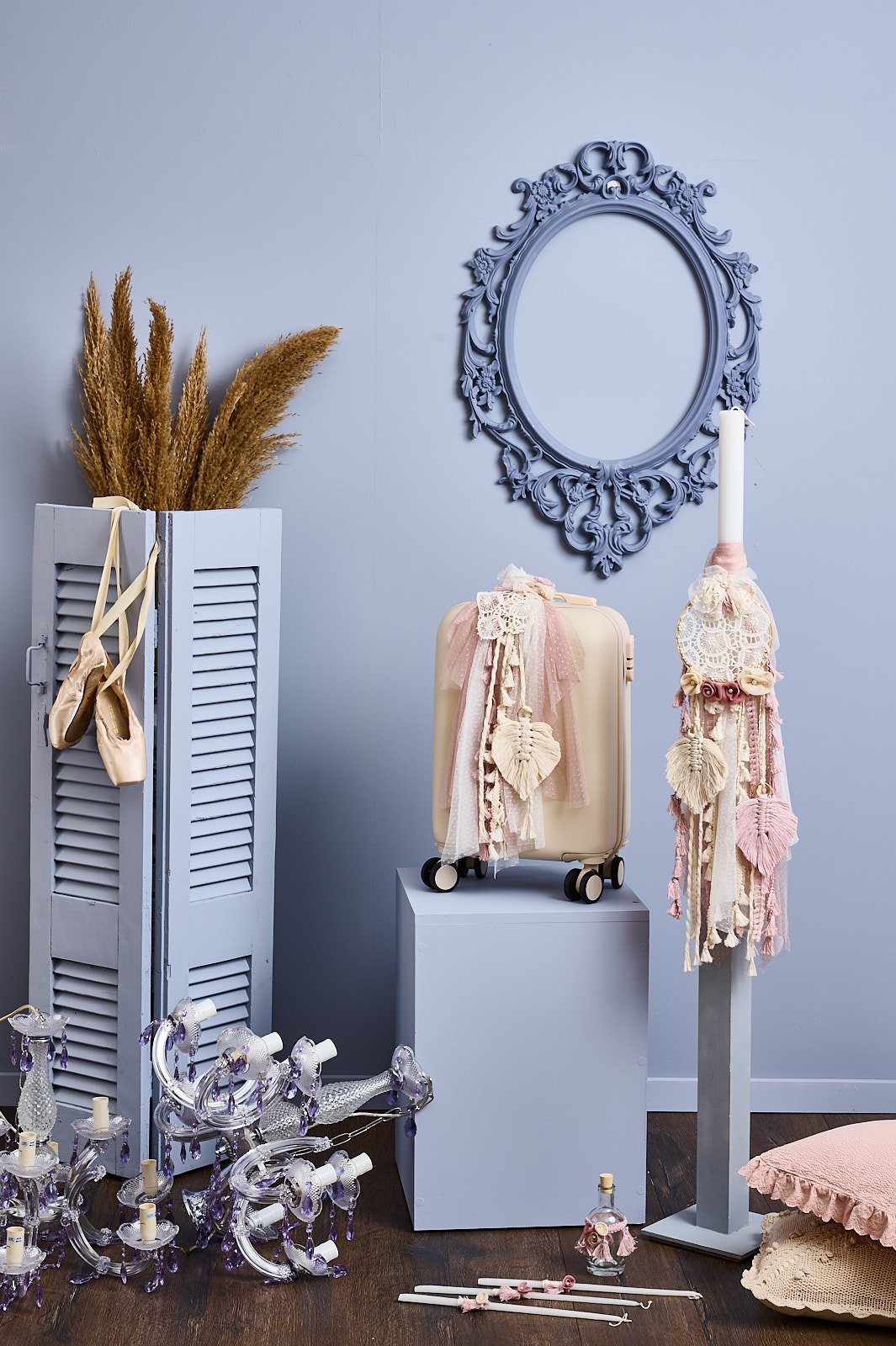 Εντυπωσιακό bοho πακέτο βάπτισης (λαμπάδα, βαλίτσα-τρόλεϋ, λαδοσετ, λαδόπανα) με ξύλινο τελάρο, καλυμμένο με δαντέλα. Κρόσια, κορδέλες από πουά τούλι, φούντες και μακραμέ φύλλα σε αποχρώσεις ιβουάρ και σάπιου μήλου κρέμονται απ’ αυτό. Μικρά υφασμάτινα τριανταφυλλάκια στις ίδιες αποχρώσεις στολίζουν το κάτω μέρος της ονειροπαγίδας.