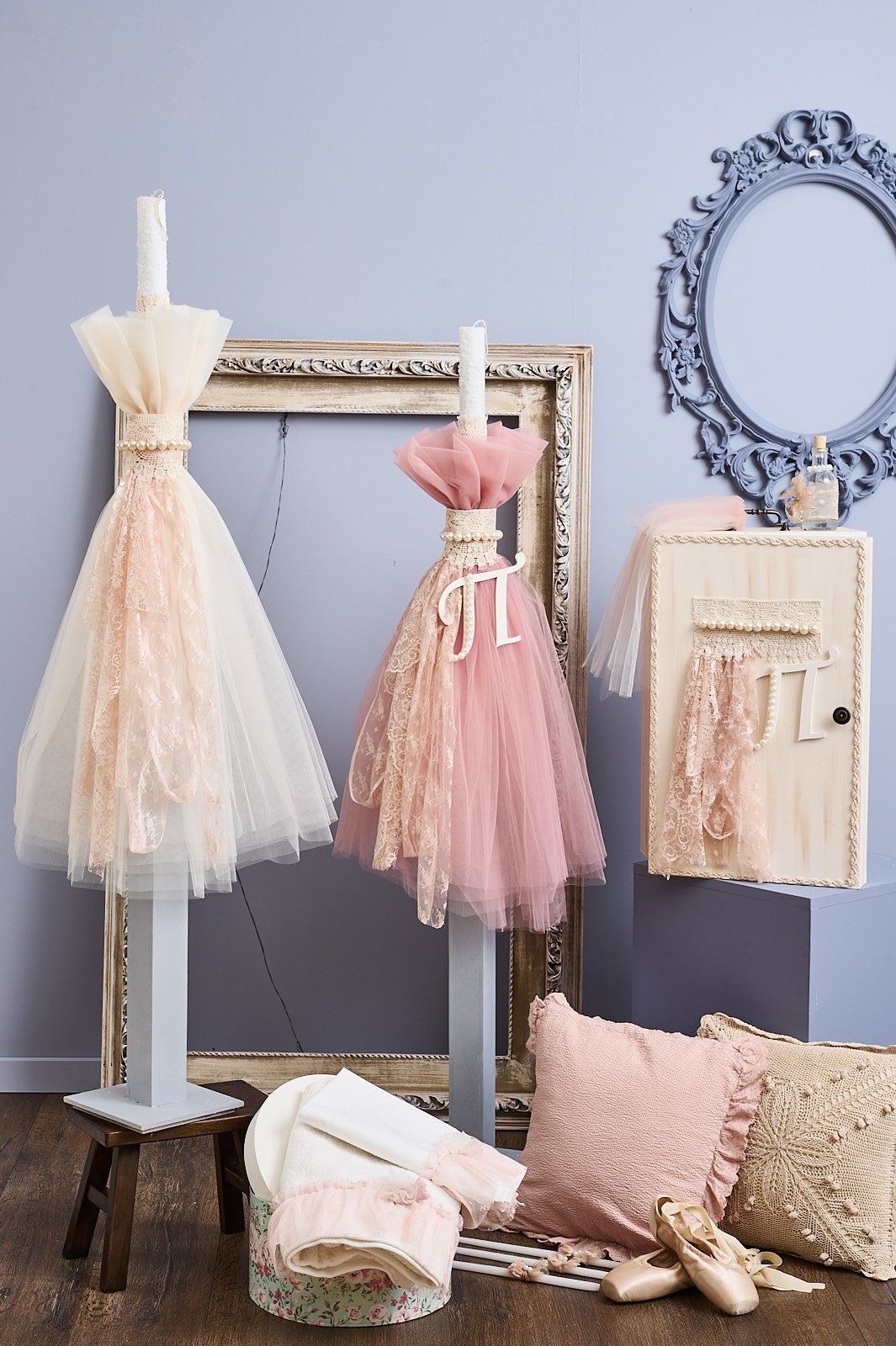 Ρομαντικό πακέτο βάπτισης (λαμπάδα, ξύλινο κουτί-ντουλάπα, λαδοσετ, λαδόπανα) με το μονόγραμμα της επιλογής σας. Λεπτομέρειες σε αποχρώσεις ιβουάρ και σάπιου μήλου, εκρού δανδέλας και πέρλες στολίζουν τόσο την λαμπάδα όσο και την ντουλάπα. Ένα όμορφο, ξύλινο, καλλιγραφικό μονόγραμμα, στολισμένο με πέρλες δίνει αριστοκρατική όψη στο πακέτο.