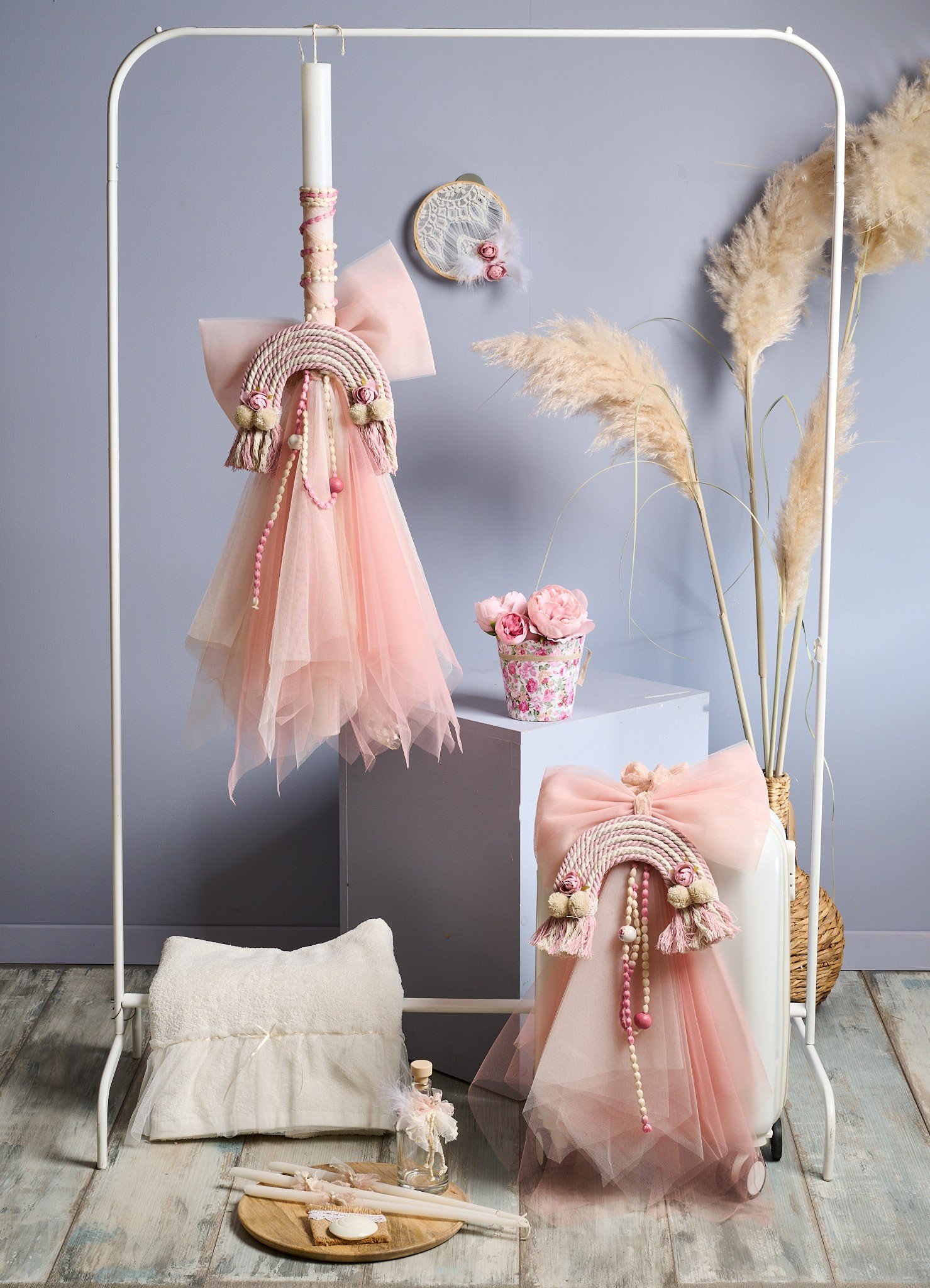 Αέρινο , εντυπωσιακό πακέτο βάπτισης (λαμπάδα, βαλίτσα, λαδοσετ, λαδόπανα) με μακραμέ ουράνιο τοξο στολισμένο απο λουλούδια και πέρλες .