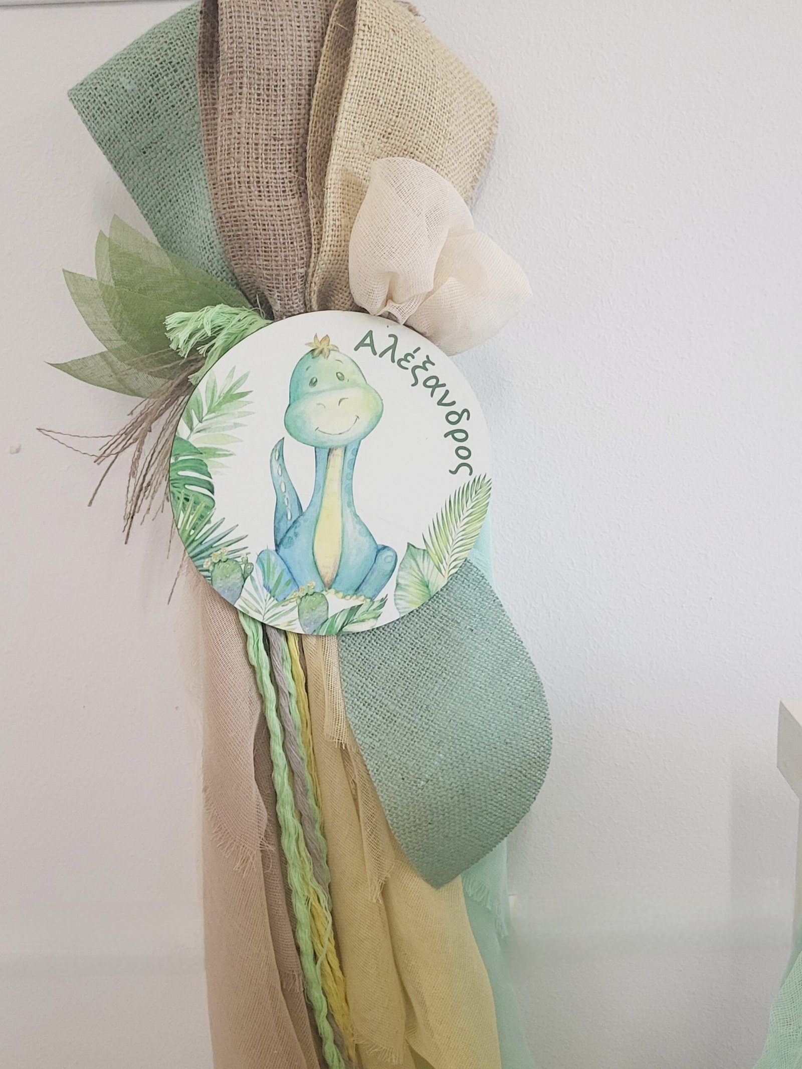 Στολισμένο με βαμβακέρα κορδόνια ,κεραμικές χάντρες σε αποχρώσεις λευκές ,μπέζ και σιέλ..Γάζες λευκές και μπέζ σιέλ και μέντα ολοκληρώνουν ολο το σύνολο.