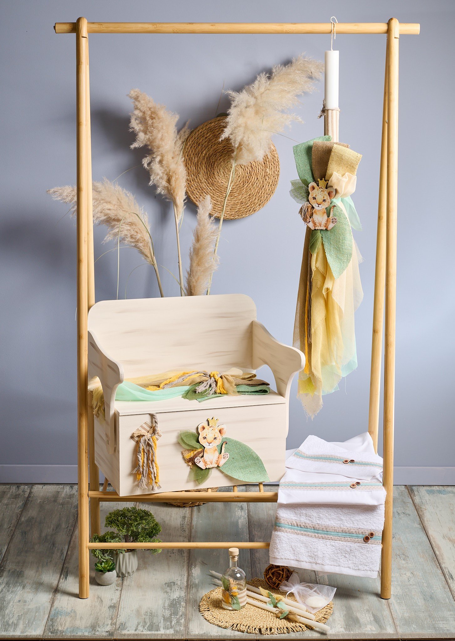 Στολισμένο με γάζες όχρα, μέντα, μπέζ κορδόνι σπαγγί και μια εντυπωσιακη ψηφιακή εκτύπωση απο ξύλο .Παγκάκι θρανίο πατίνας ασορτί στολισμένο ,λαδοσέτ ασορτι και λαδόπανα ασορτί.