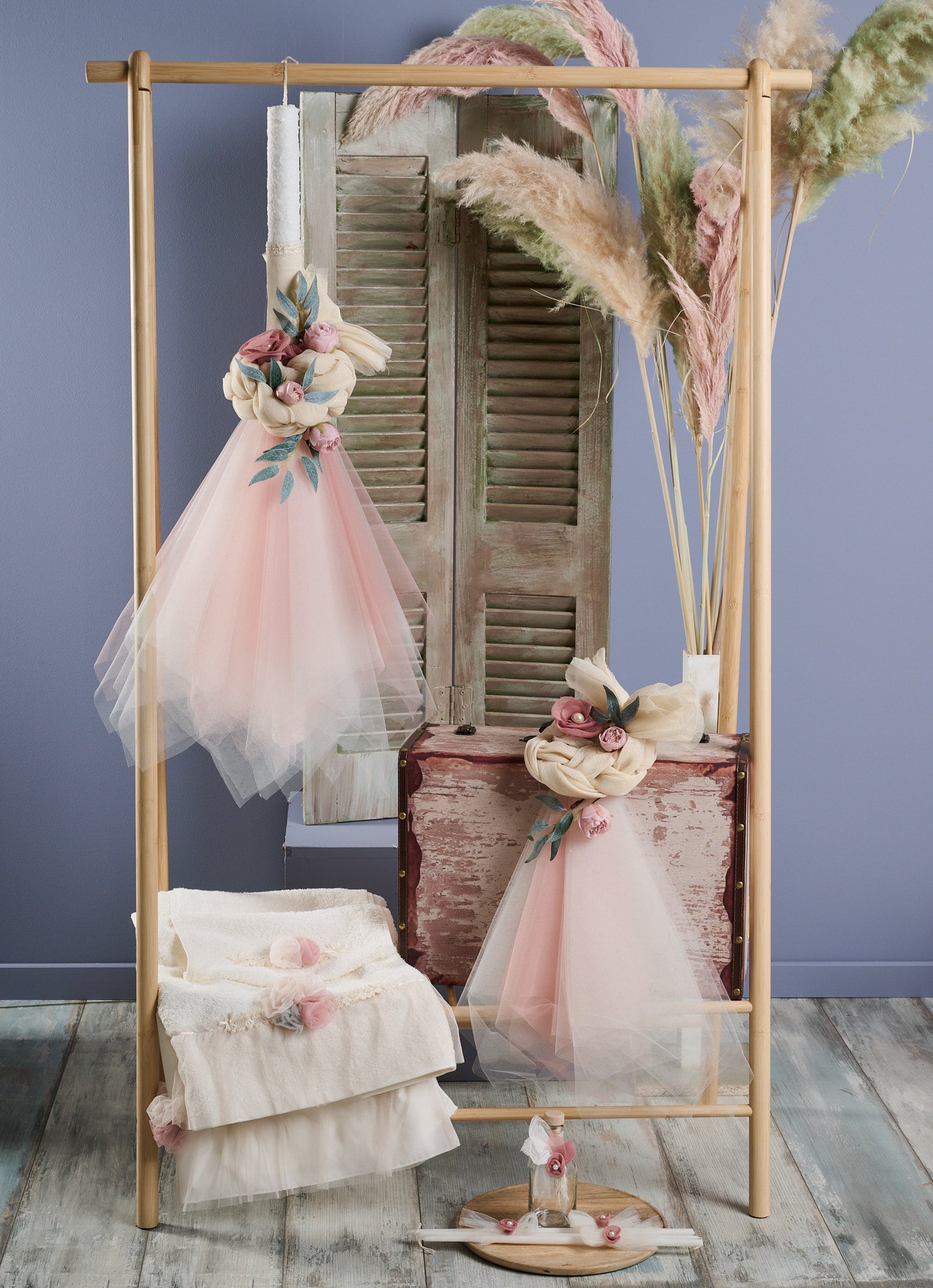Chic, εντυπωσιακό πακέτο βάπτισης (λαμπάδα, μπράνς , λαδοσετ, λαδόπανα) .