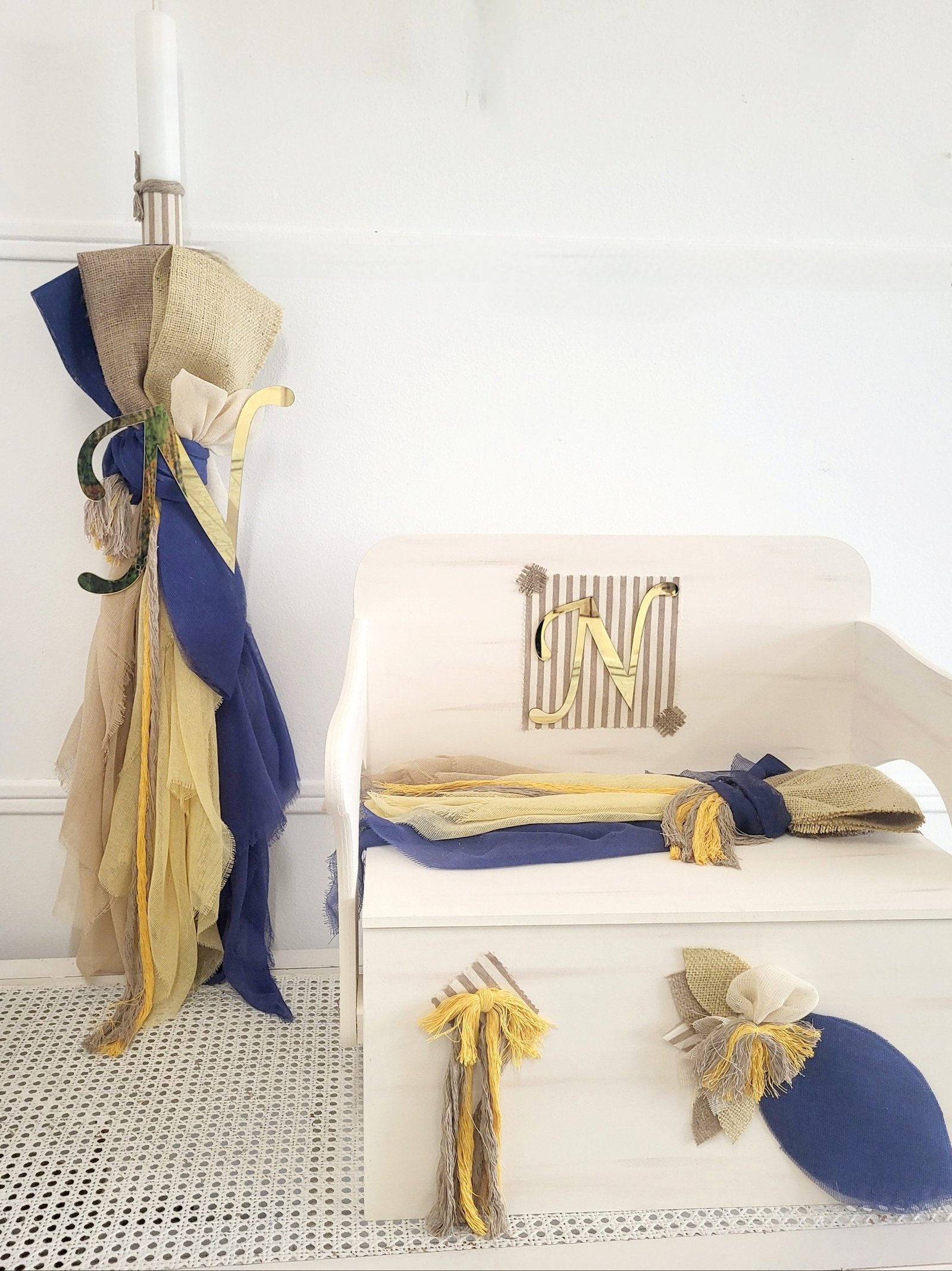 Πακέτο βάπτισης για αγόρι (λαμπάδα, παγκάκι-θρανίο από πατίνα, λαδόπανα, λαδοσέτ) με πλούσιο δέσιμο από γάζα μπλέ , λινάτσα φυσική και μπέζ ,βαμβακερό κίτρινο και φυσικό σχοινί . Μονόγραμμα σε χρυσό καθρέπτη , ολοκληρώνει το σύνολο.