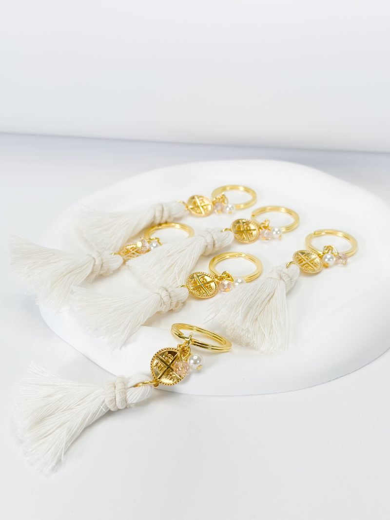 Μαρτυρικό μπρελόκ με χειροποίητη εκρού φούντα, σταυρό κωνσταντινάτο, κρύσταλλο και πέρλα.