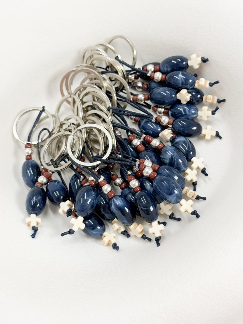 Μαρτυρικό μπρελοκ σε ασημί απόχρωση με χαολίτη σταυρό και χάντρα με νερά.