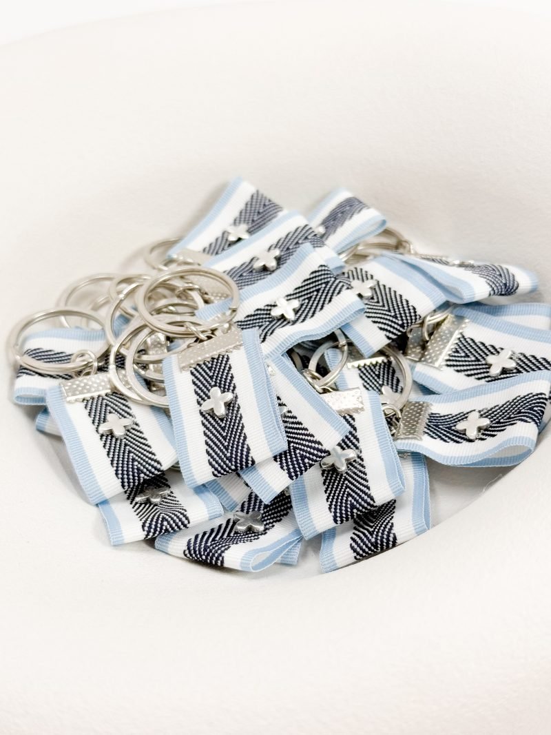 Μαρτυρικό μπρελόκ σε ασημί απόχρωση με κολλητό σταυρό και τρίχρωμη τρέσα.