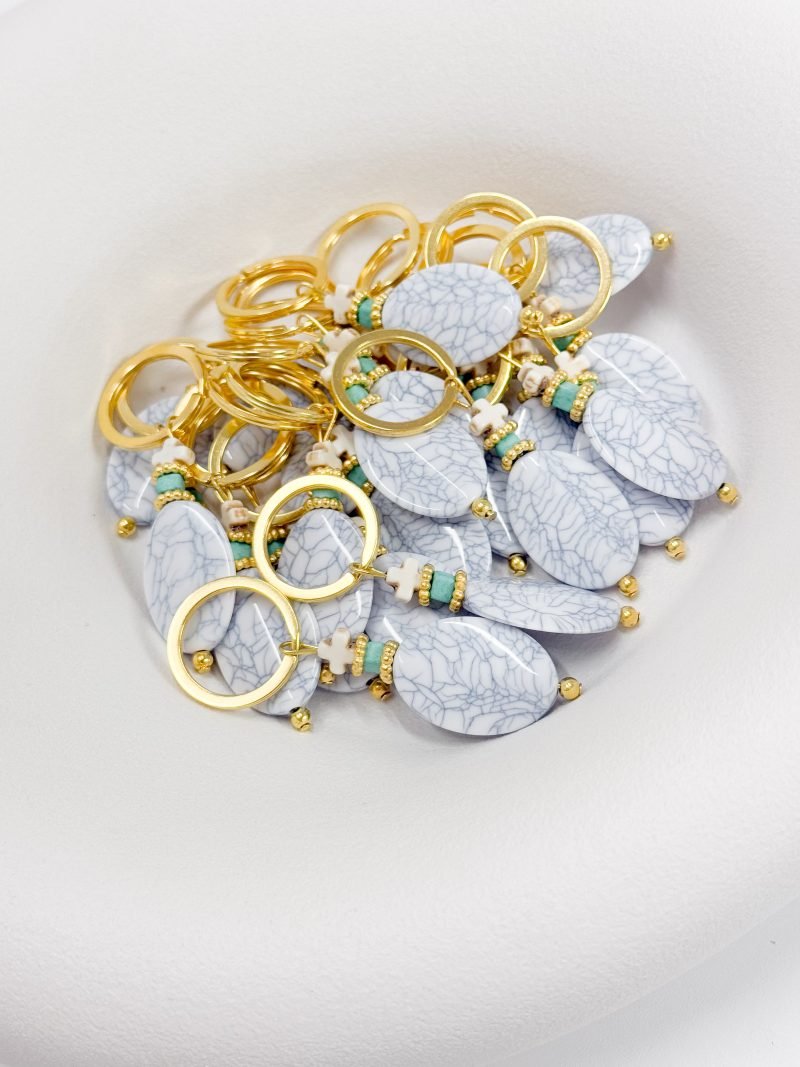 Μαρτυρικό μπρελόκ με χαολίτη σταυρό, κύβο και χάντρα με νερά.