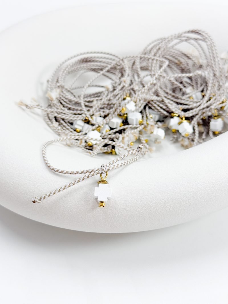 Μαρτυρικό βραχιόλι με ξύλινο λευκό σταυρό και δίχρωμο κορδόνι.