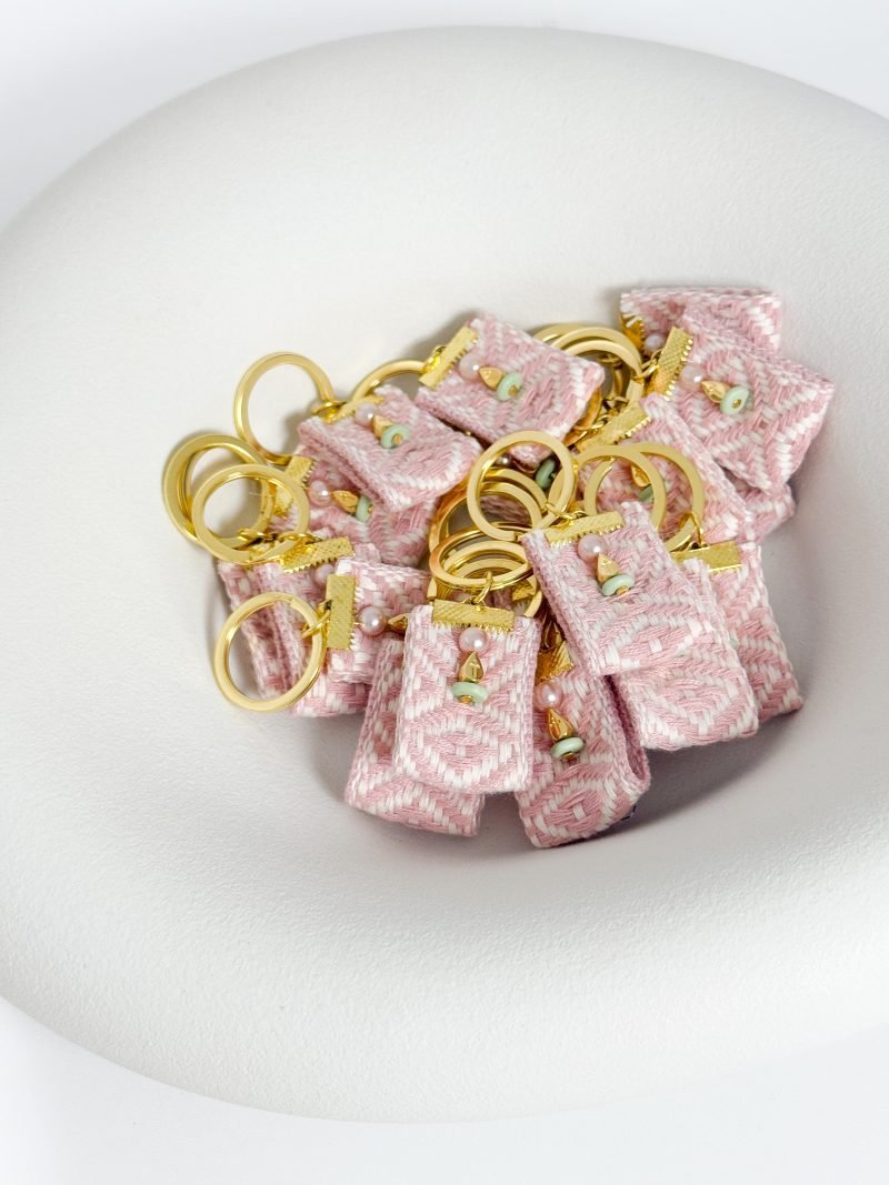 Μαρτυρικό μπρελόκ με επιχρυσωμένο σταυρό, χάντρα, πέρλα και ροζ-λευκή τρέσα.