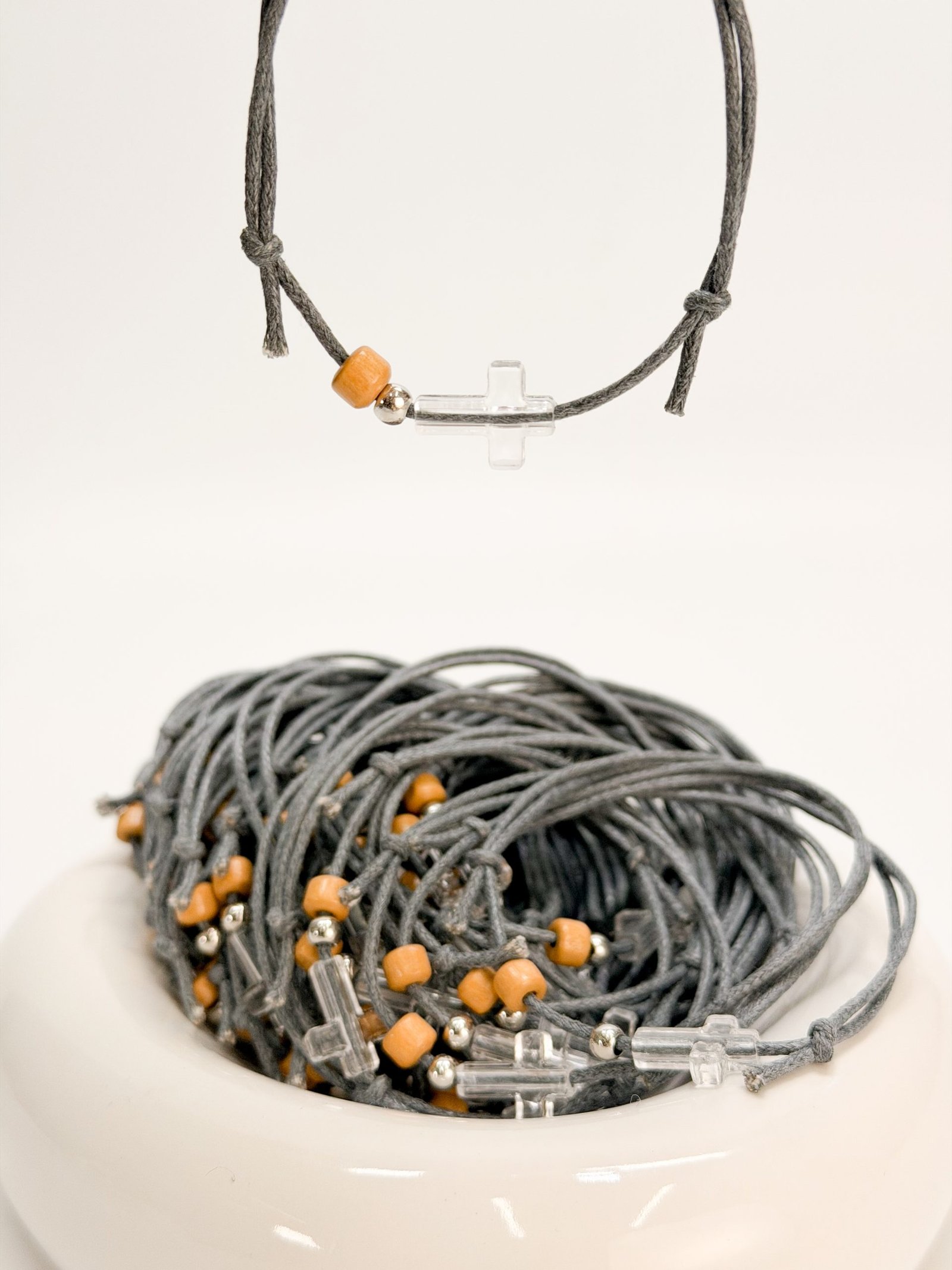 Μαρτυρικό βραχιόλι με γκρι κορδόνι,διάφανο ακρυλικό σταυρό και ξύλινη χάντρα.