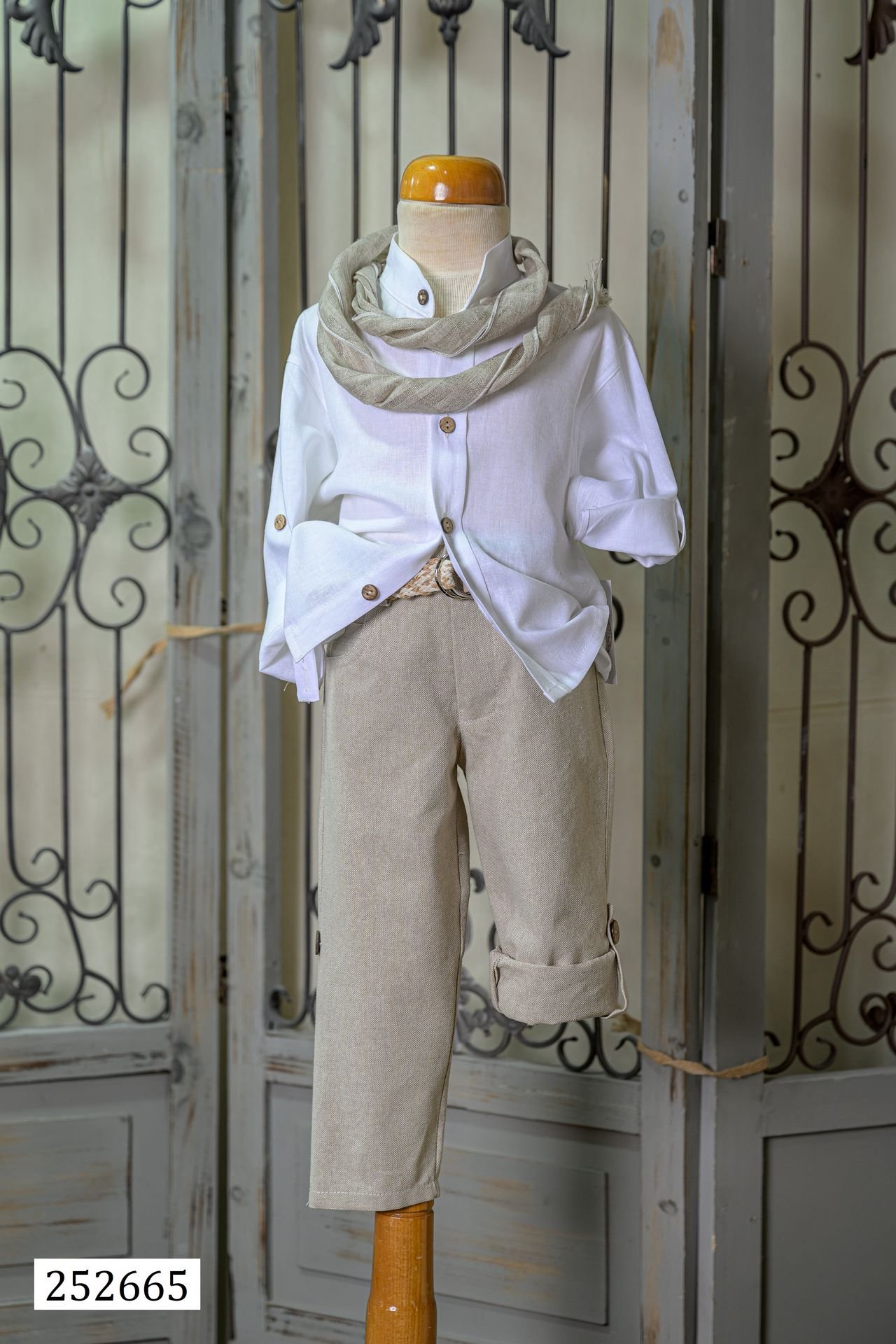 Βαφτιστικό σύνολο αποτελούμενο απο μπεζ παντελόνι, ζώνη, λευκό πουκαμισο και φουλάρι.