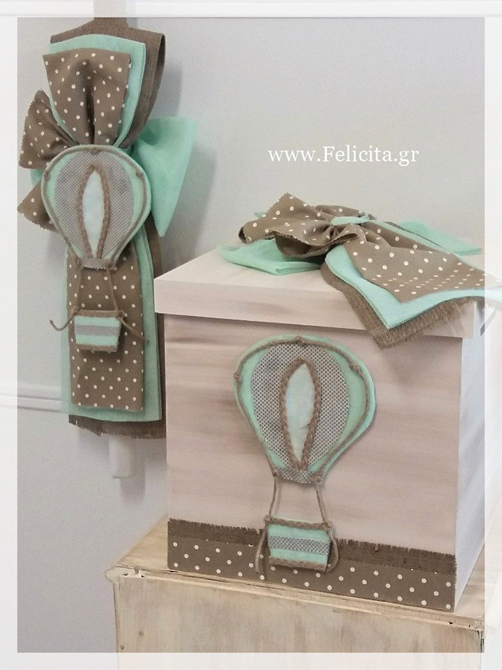 Πακέτο βάπτισης για αγόρι (κουτί πατίνας, λαμπάδα, λαδοσέτ) με κυρίαρχο στοιχείο το αερόστατο σε τόνους μόδας και βεραμάν. Πλαισιώνεται από καφέ, βεραμάν και πουά αποχρώσεις .