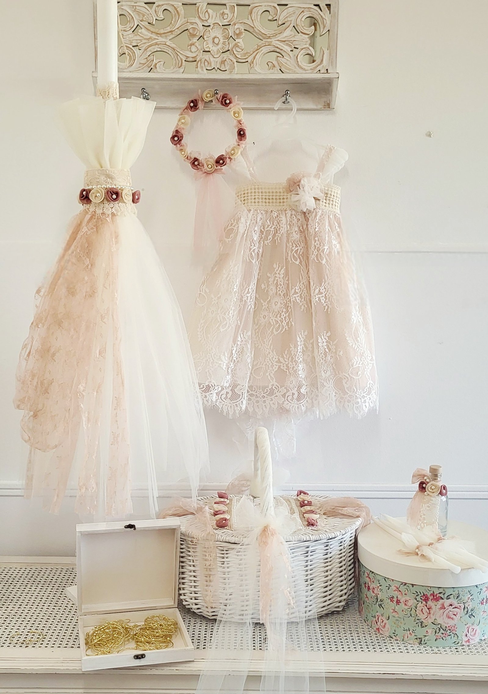 Ένα υπέροχο πακέτο βάπτισης με λαμπάδα λαδοσέτ, καλάθι πικ νικ ασορτι στολισμένο,κουτί μαρτυρικων και φυσικά