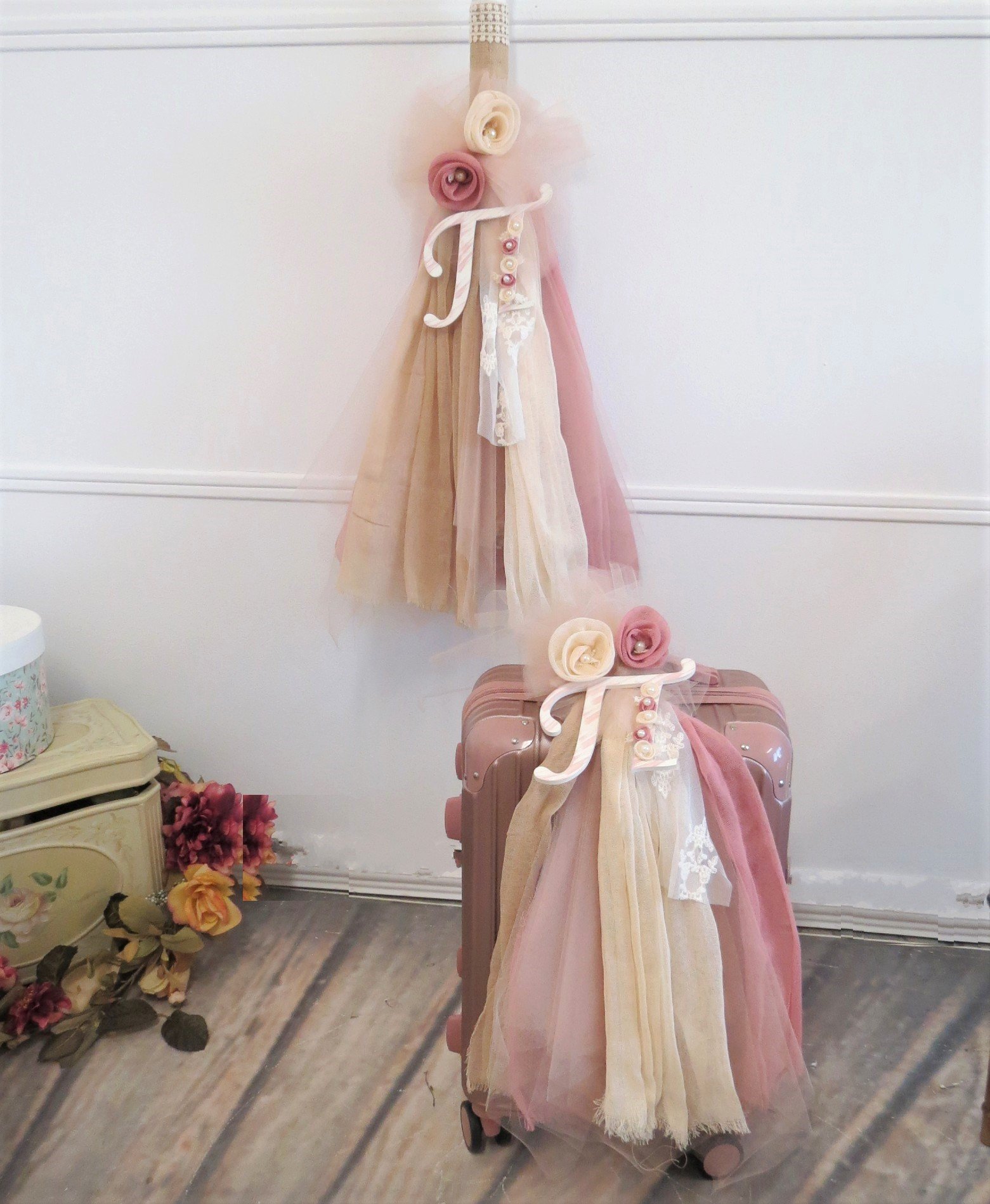 Τούλινες στρώσεις σε αποχρώσεις ροζ, σάπιου μήλου, εκρού και καραμέλας δένουν ψηλά τούλινη λευκή δαντέλα, τριαντάφυλλα από γάζα σάπιου μήλου και μπεζ. Ένα μεγάλο καλλιγραφικό μονόγραμμα κάνει το πακέτο πιο ιδιαίτερο.