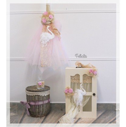 Ένα ρομαντικό πακέτο βάπτισης (λαμπάδα, ντουλάπα, λαδοσετ, λαδόπανα) με εκρού και ροζ τούλι. Ένα όμορφο μπουκέτο από τούλινα λουλούδια καταλήγει σε έναν όμορφο κατάλευκο κύκνο που πλαισιώνεται από φαρδιά, δαντελένια κορδέλα.