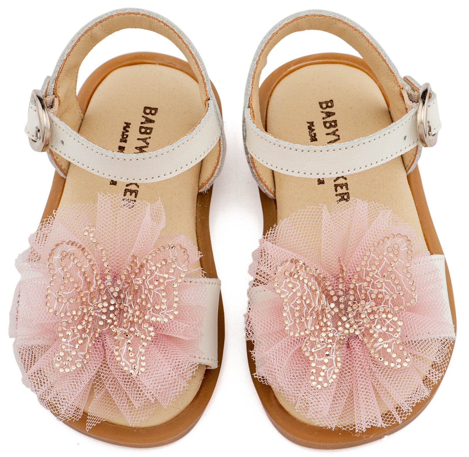 Δερμάτινο Πέδιλο Διακοσμημένο με Χειροποίητη Πεταλούδα και Τούλι σε Εκρού Ροζ Χρώμα