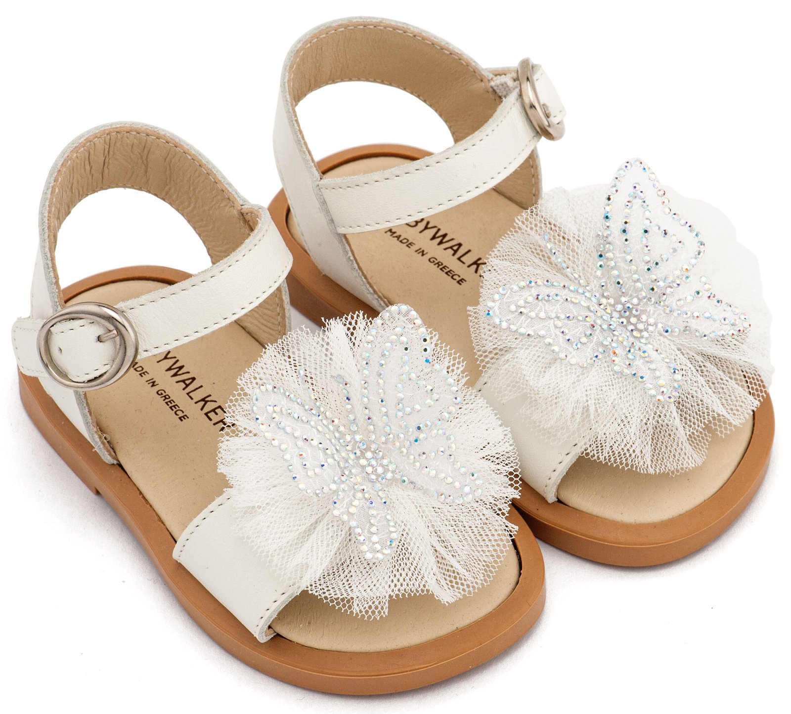 Δερμάτινο Πέδιλο Διακοσμημένο με Χειροποίητη Πεταλούδα και Τούλι σε Εκρού Χρώμα
