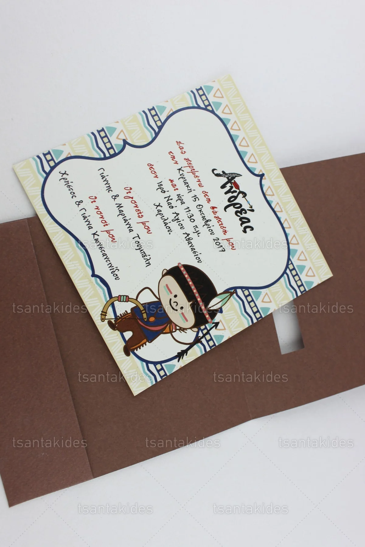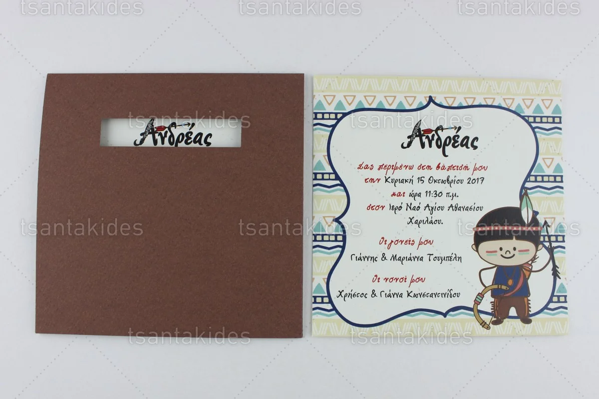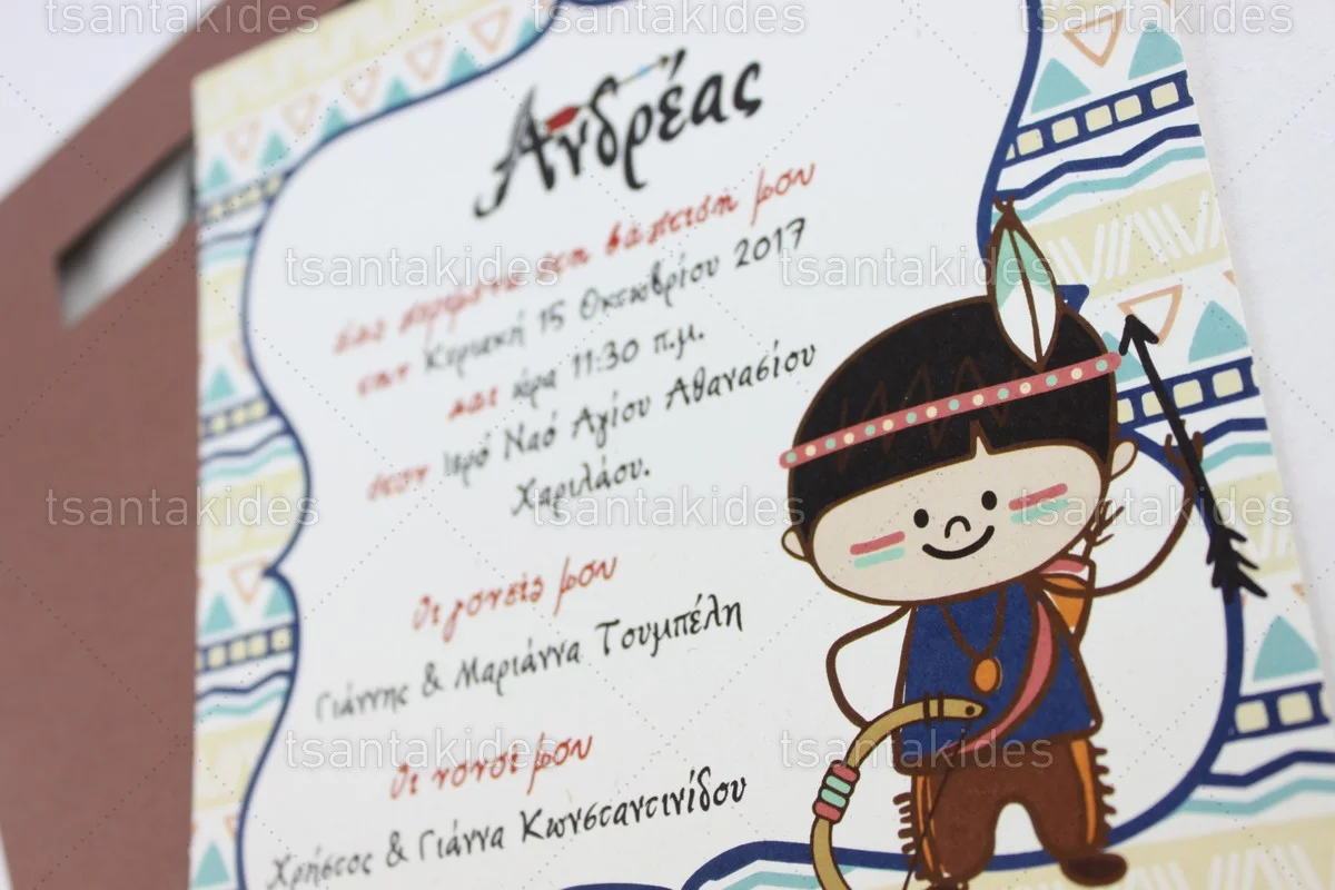 Προσκλητήριο βάπτισης για αγόρι εκτυπωμένο με θέμα Ινδιάνος