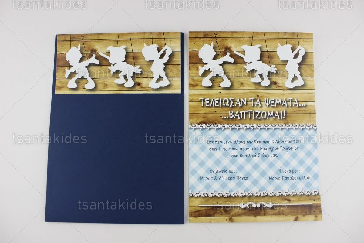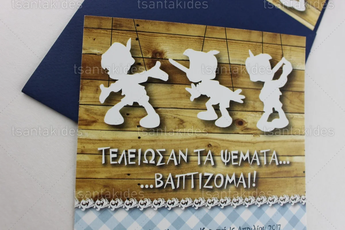Προσκλητήριο βάπτισης για αγόρι εκτυπωμένο με θέμα Πινόκιο