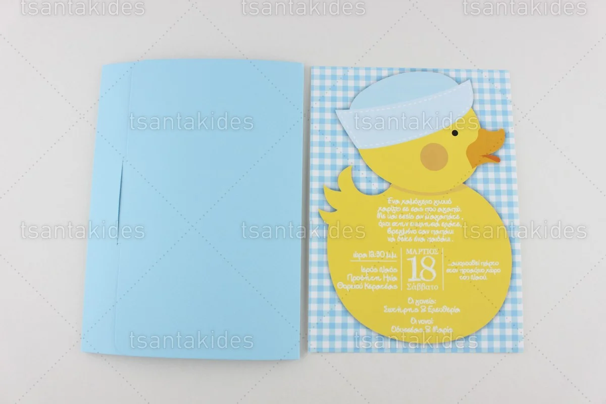 Προσκλητήριο βάπτισης για αγόρι εκτυπωμένο με θέμα Παπάκι