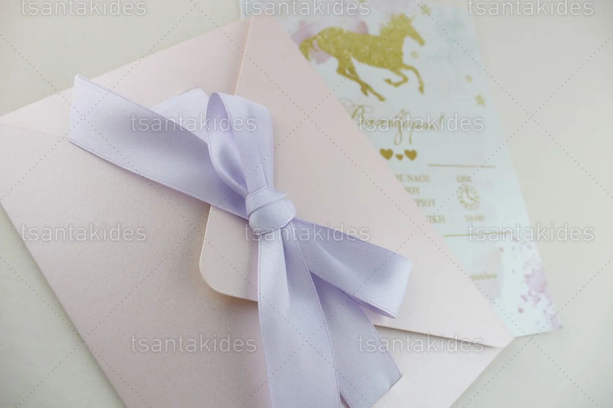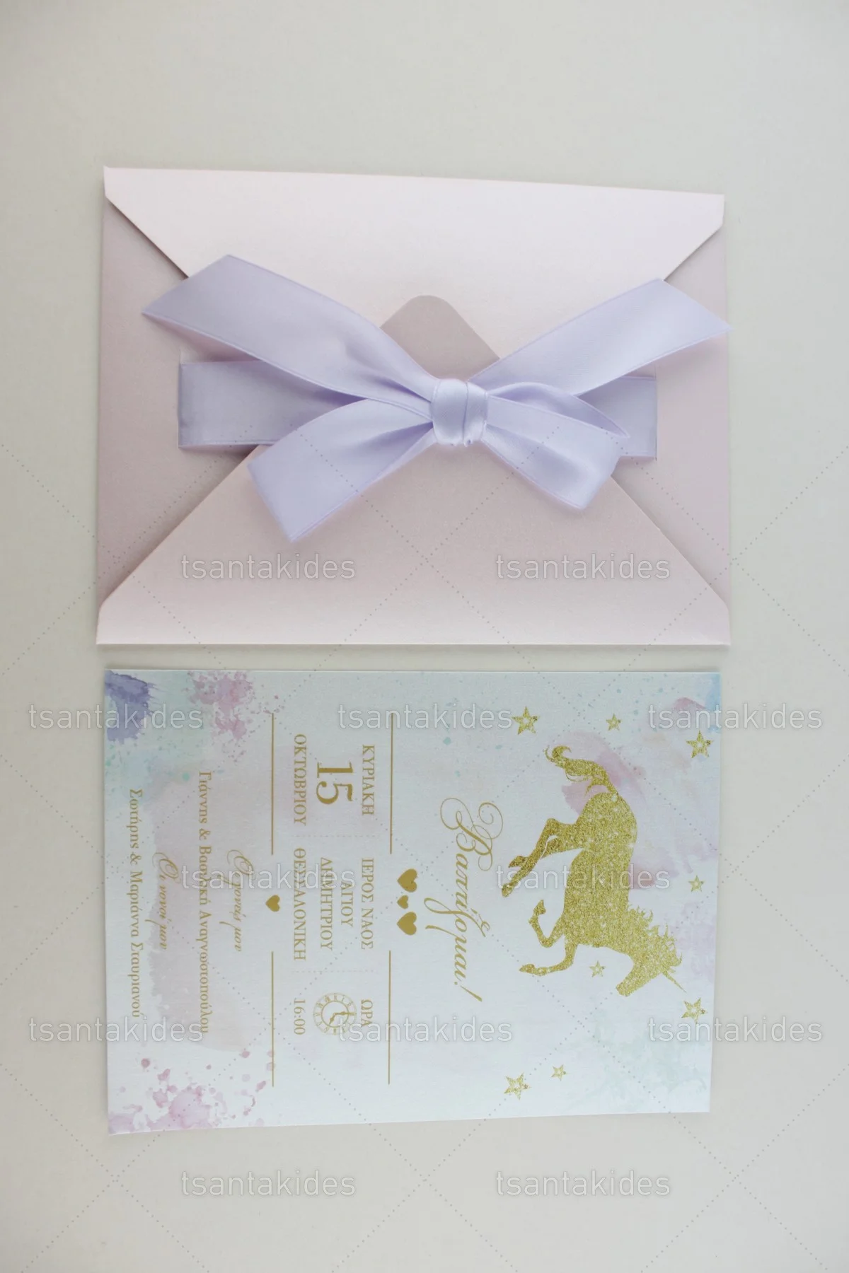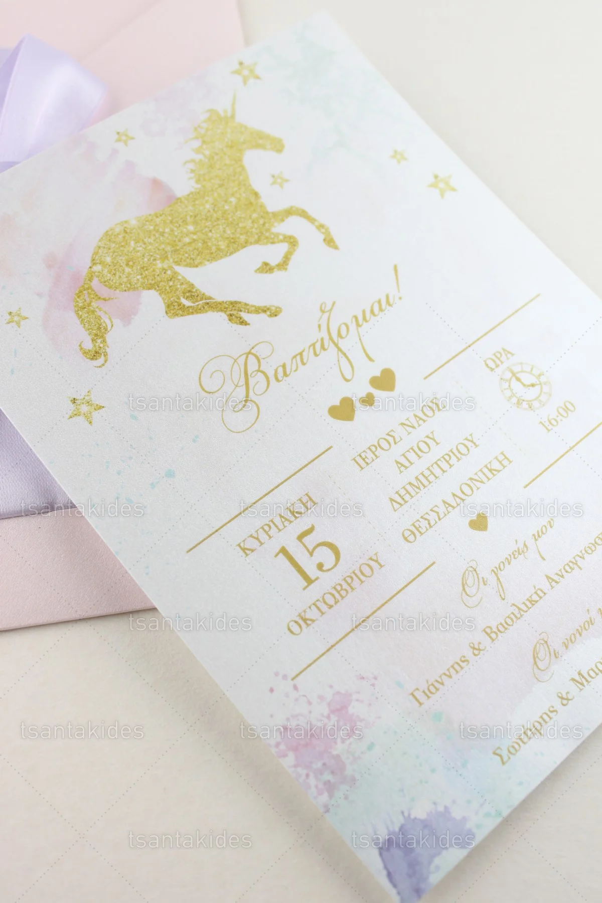 Προσκλητήριο βάπτισης για κορίτσι εκτυπωμένο με θέμα Μονόκερος